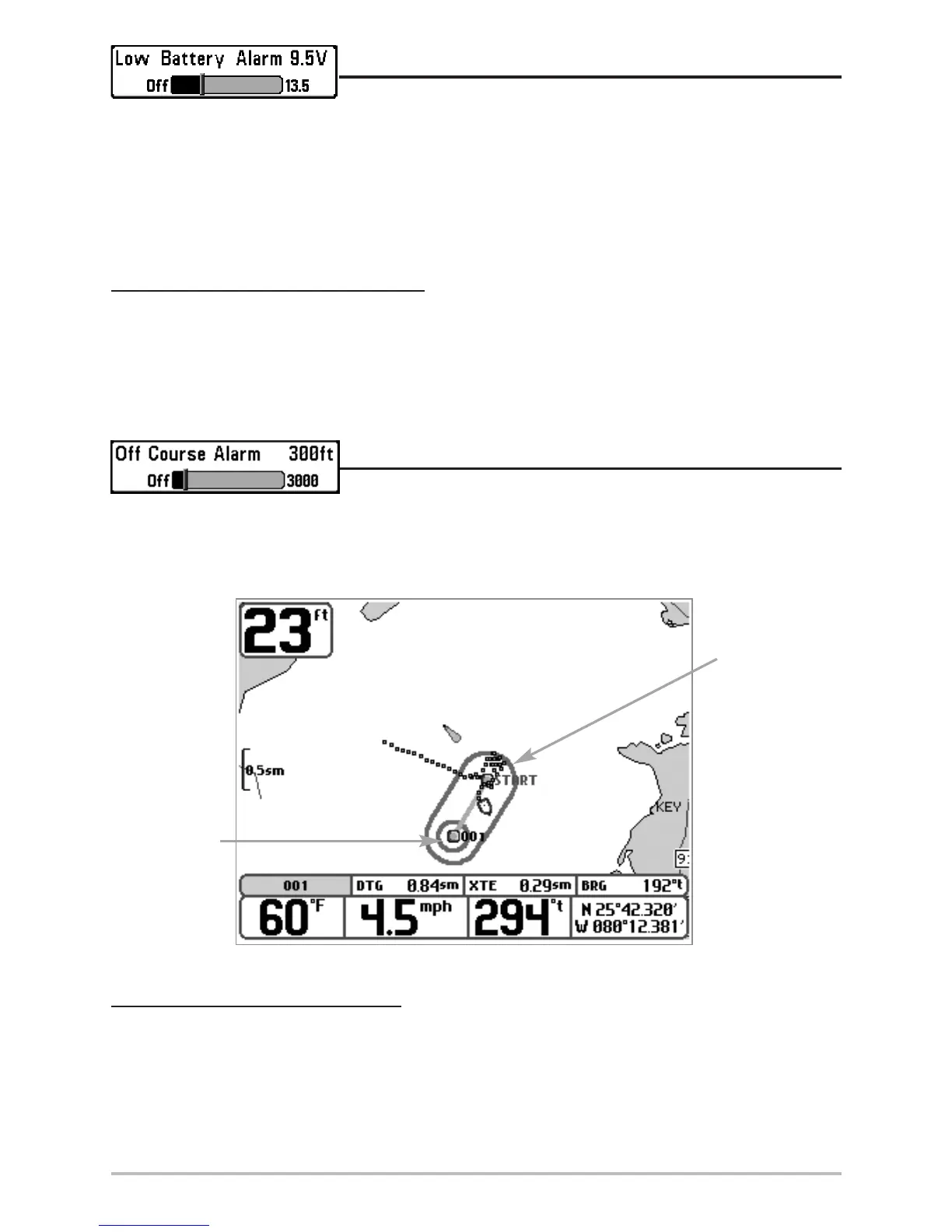 based on the menu setting when navigating. Off Course Alarm allows you to set how far the boat is
