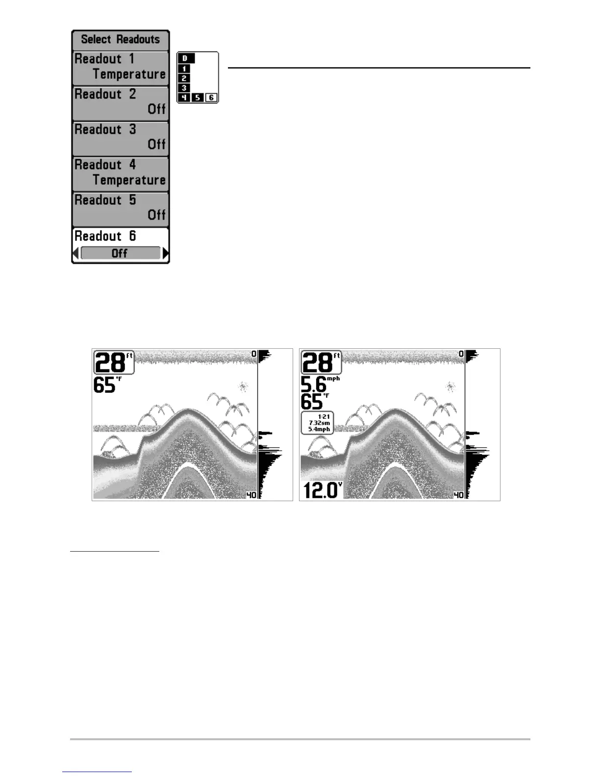 Select Readouts sets individual digital readouts on the Sonar