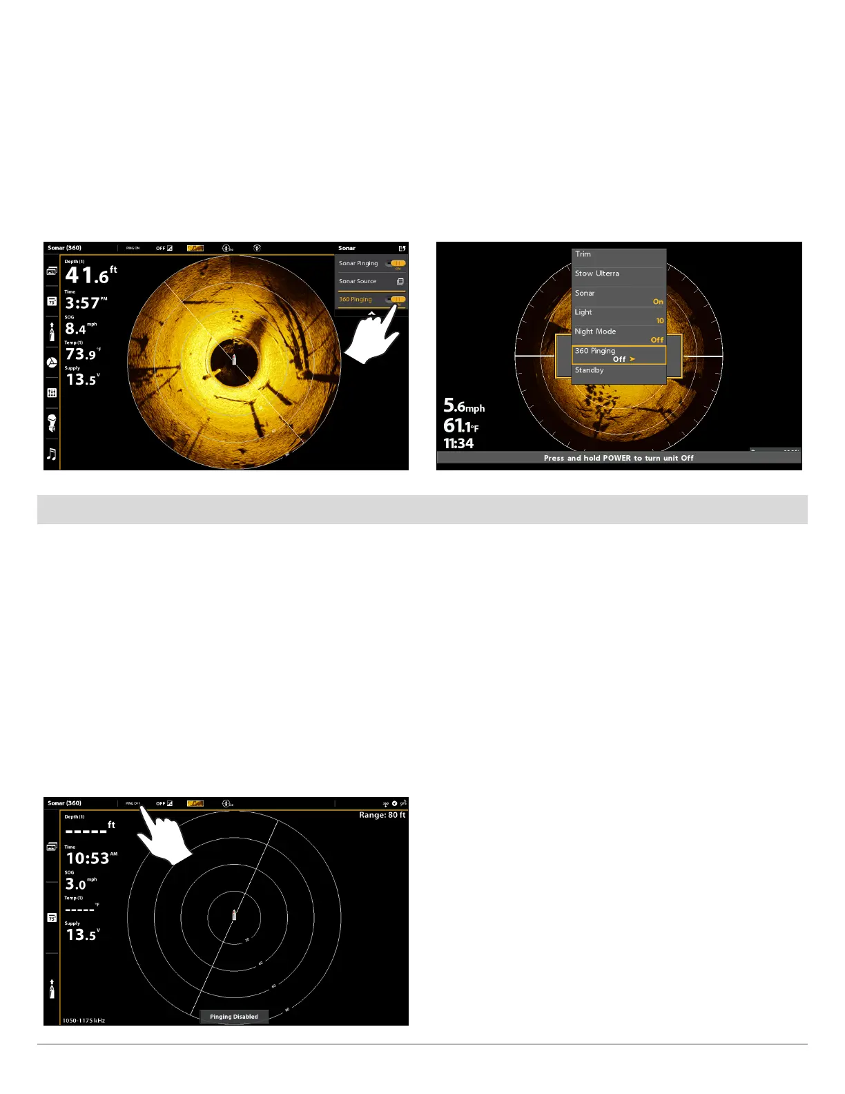 1. With a 360 View or 360 Imaging Combo View displayed on the screen, tap PING OFF on the MEGA 360 status bar.