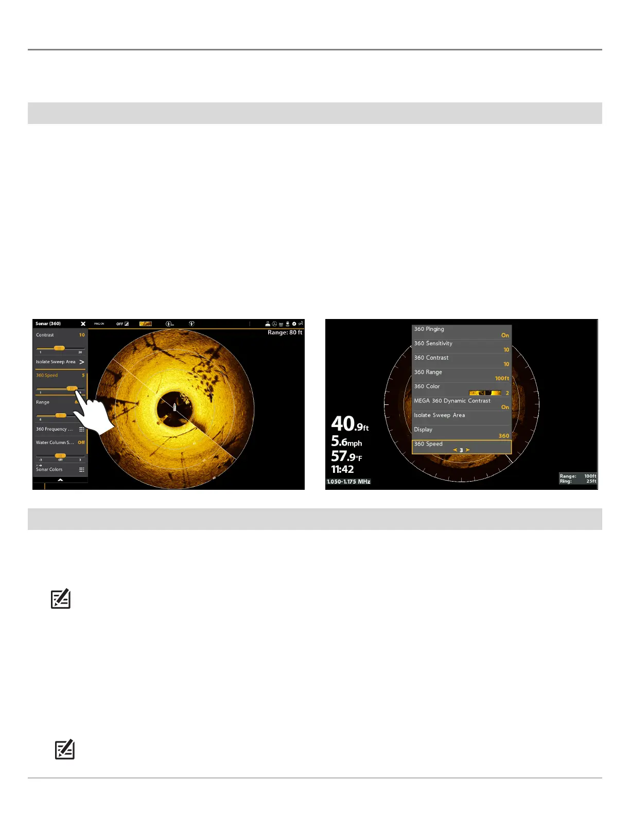 The 360 Imaging menu options allow you to change the sweep speed and range. The settings you use will influence how quickly the