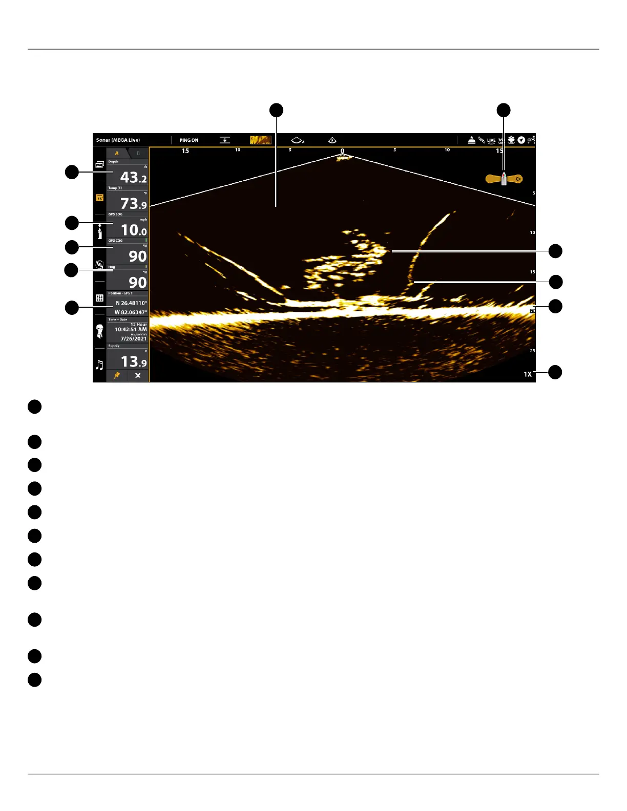 Boat Icon: The boat icon shows the orientation of the transducer relative to the boat (GPS heading sensor required).