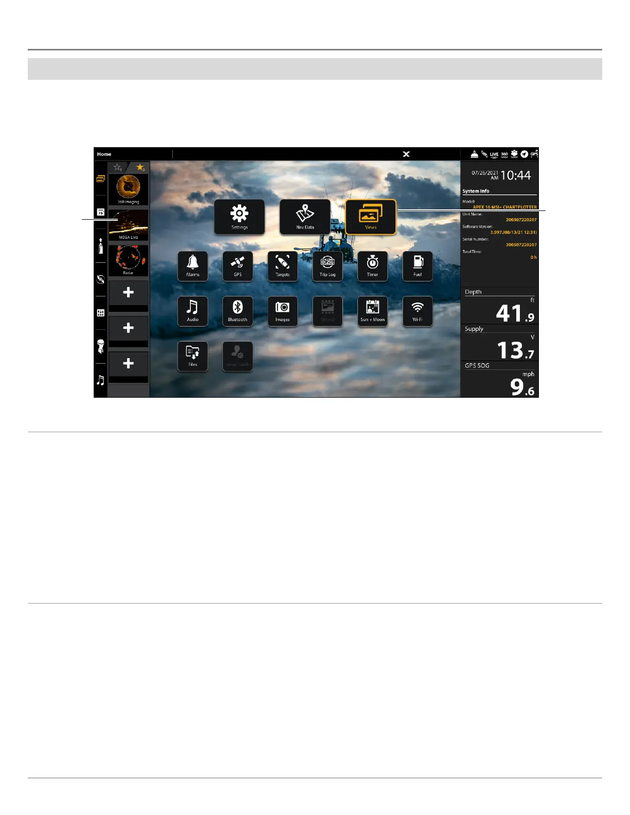 When the MEGA Live Imaging transducer is set up on the control head, the MEGA Live View is added to the Favorite Views widget,