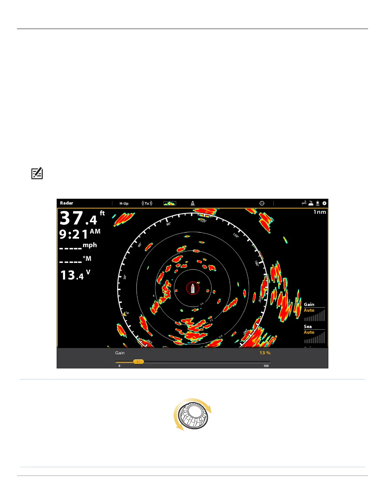 Use the Gain setting to adjust the sensitivity of the radar. Increase the gain to see more targets on the view, and decrease the