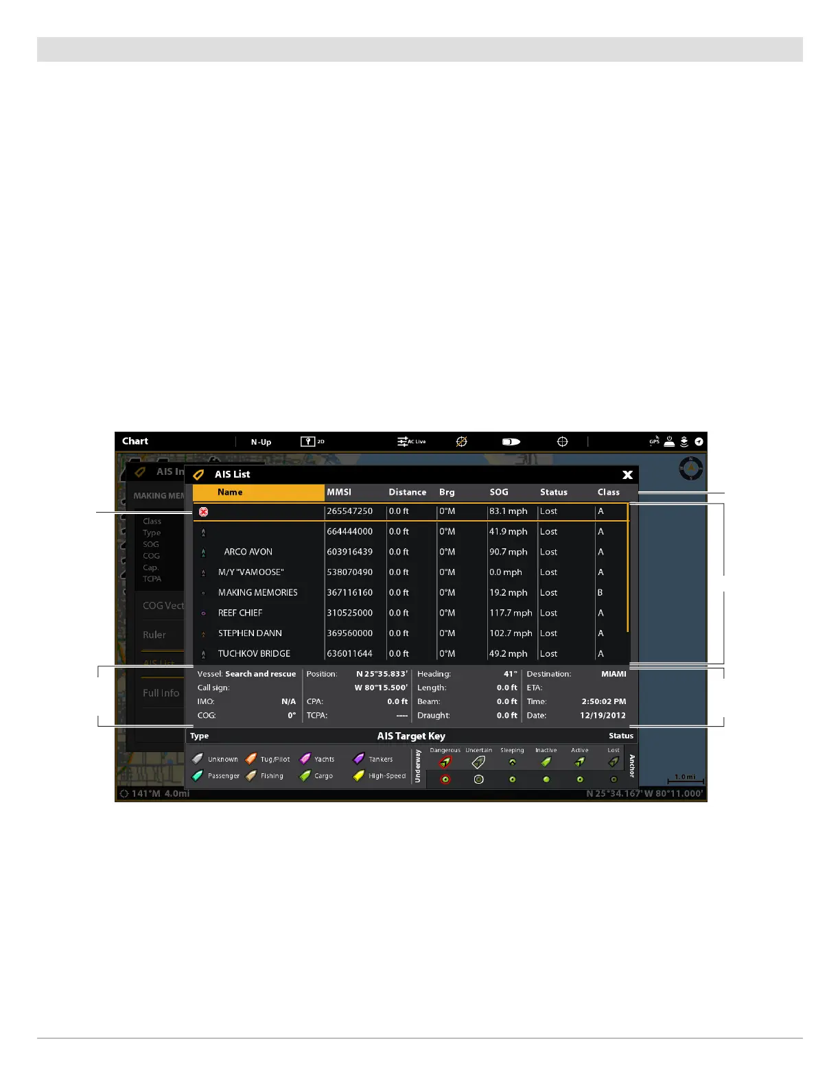Identity, Distance, Bearing, SOG, and Class. The AIS List can be opened in the Targets tool, or it can be opened in the Chart and