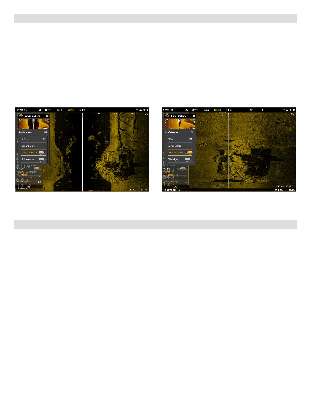When Contour Mode is turned on, the bottom is graphed at a constant point on the display, regardless of changes in depth. The Side