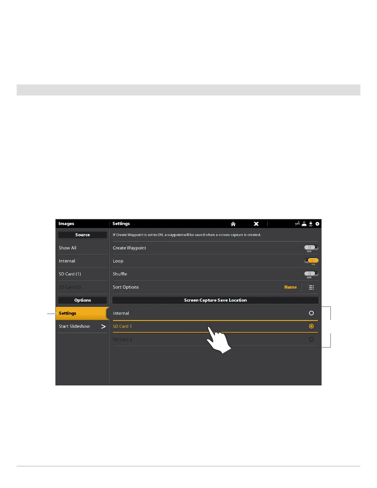 5. Under Screen Capture Save Location, select an installed source. (left port = SD Card 1 or right port = SD Card 2; Default =