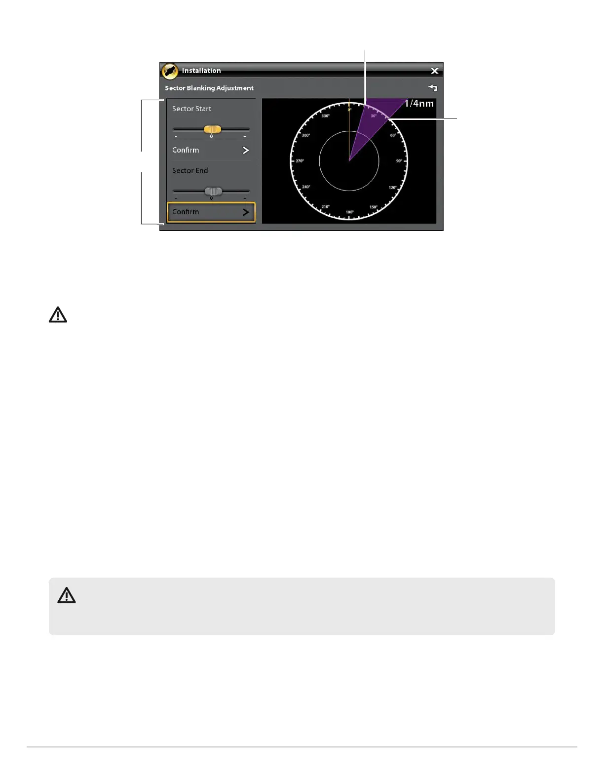 WARNING! Targets in the Sector Blanking Range are not displayed on the Radar View.