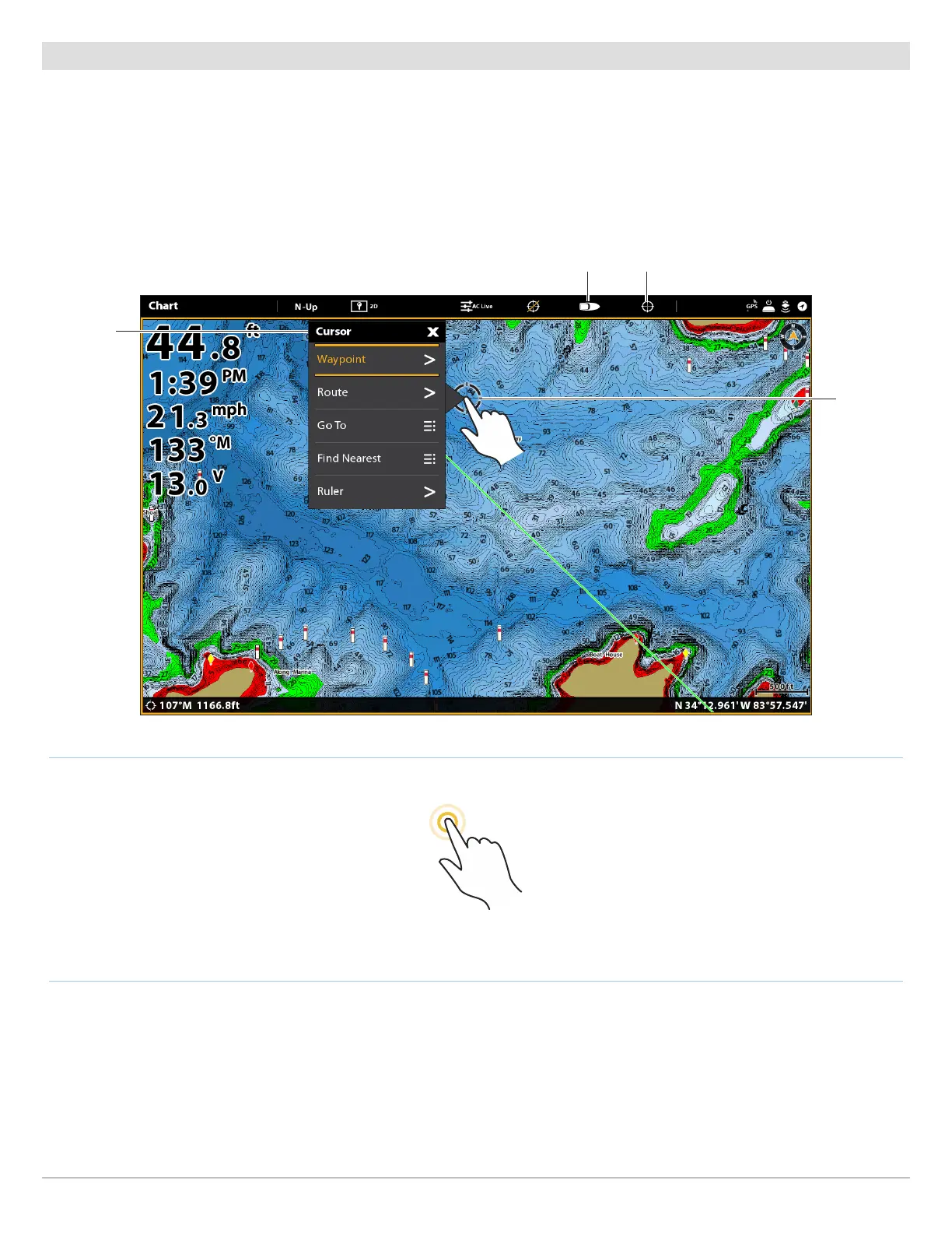 The Cursor menu is another way to use the touch sceen and mark a waypoint, create a route, or start a search. The Cursor menu is