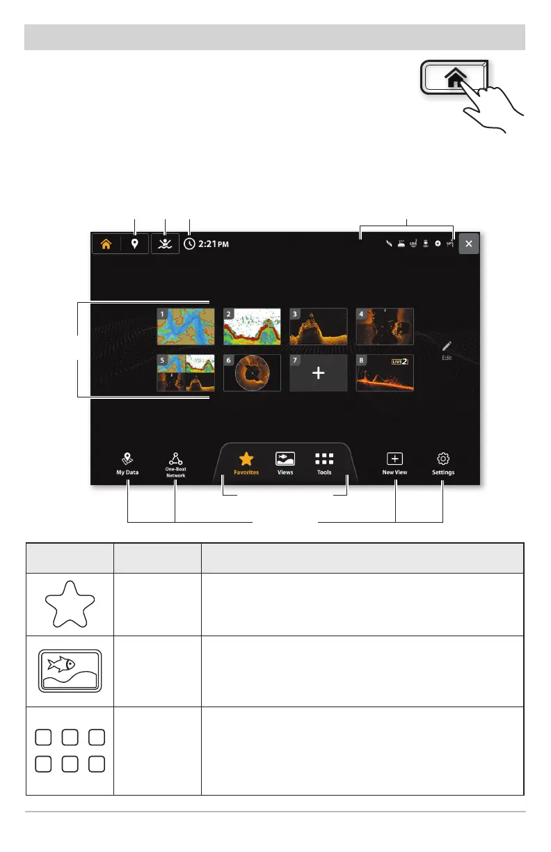 the Home screen to access views, favorites, settings, navigation