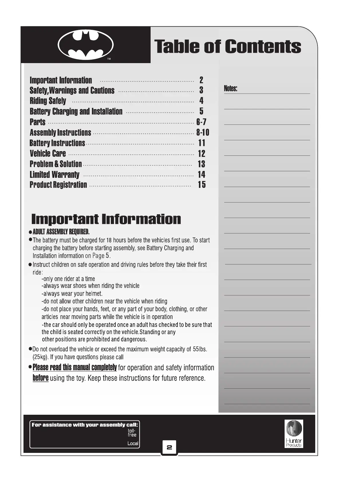 Hunter Products Batmobile - Table of Contents; Important Information