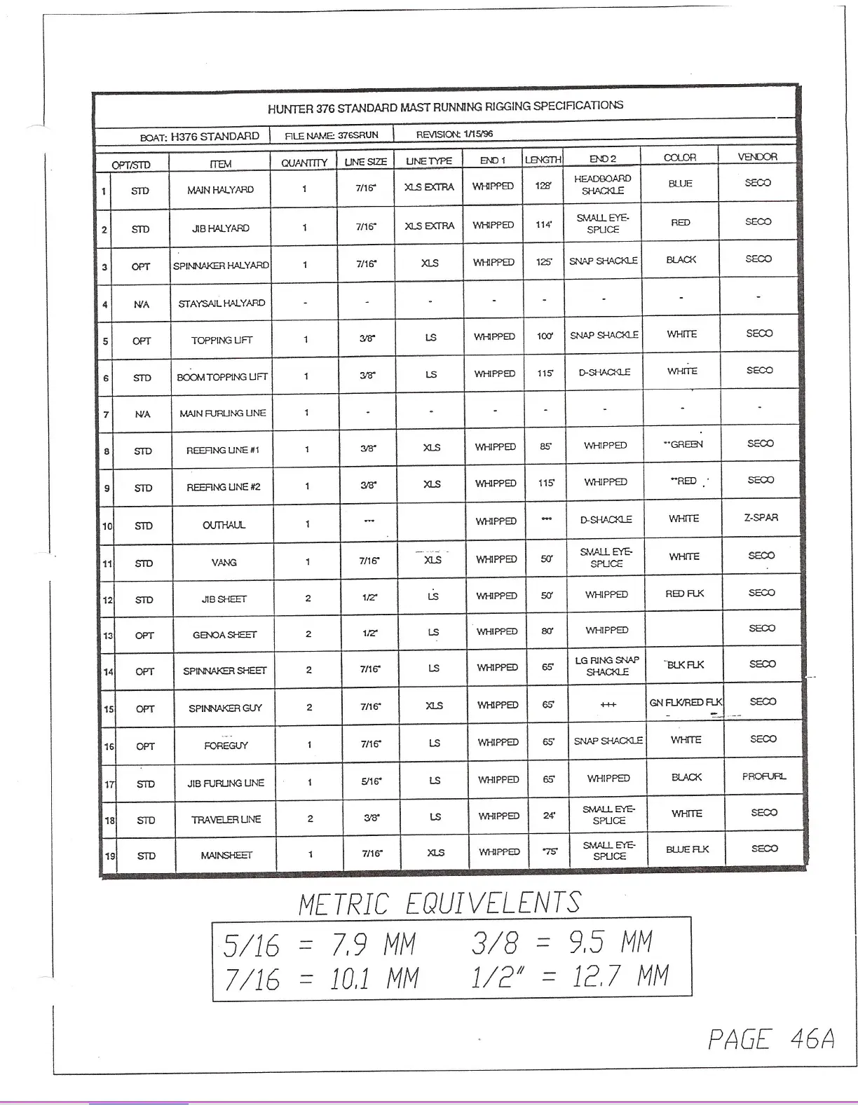 Hunter 380 - Hunter 376 Standard Mast Running Rigging Specifications