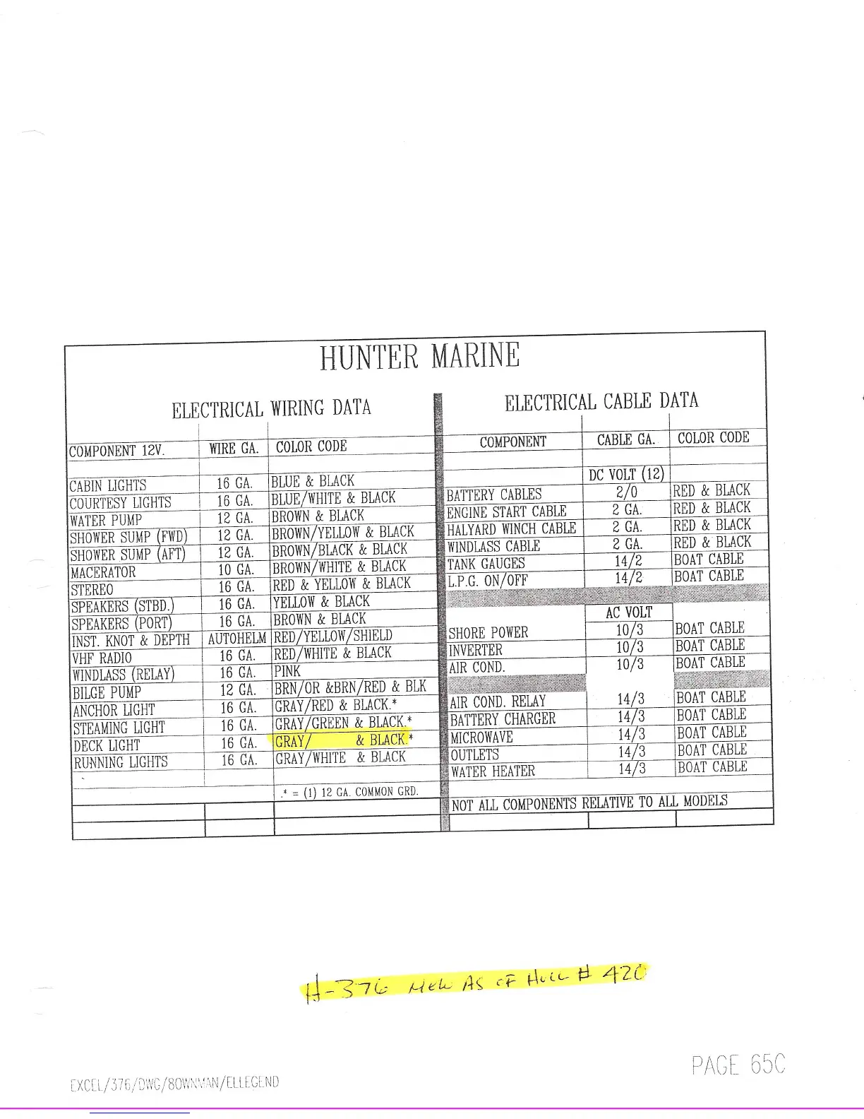 Hunter 380 - Electrical Wiring Data; Electrical Cable Data