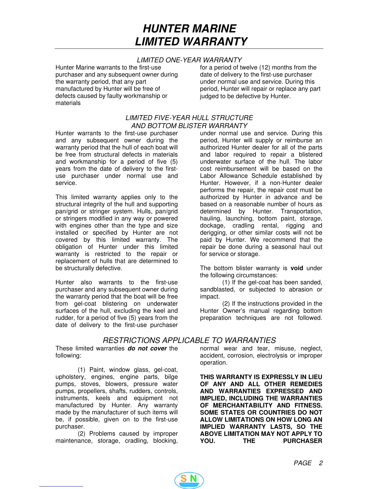 Hunter 386 - Hunter Marine Limited Warranty; Limited One-Year Warranty; Five-Year Hull Structure and Blister Warranty; Warranty Restrictions and Exclusions
