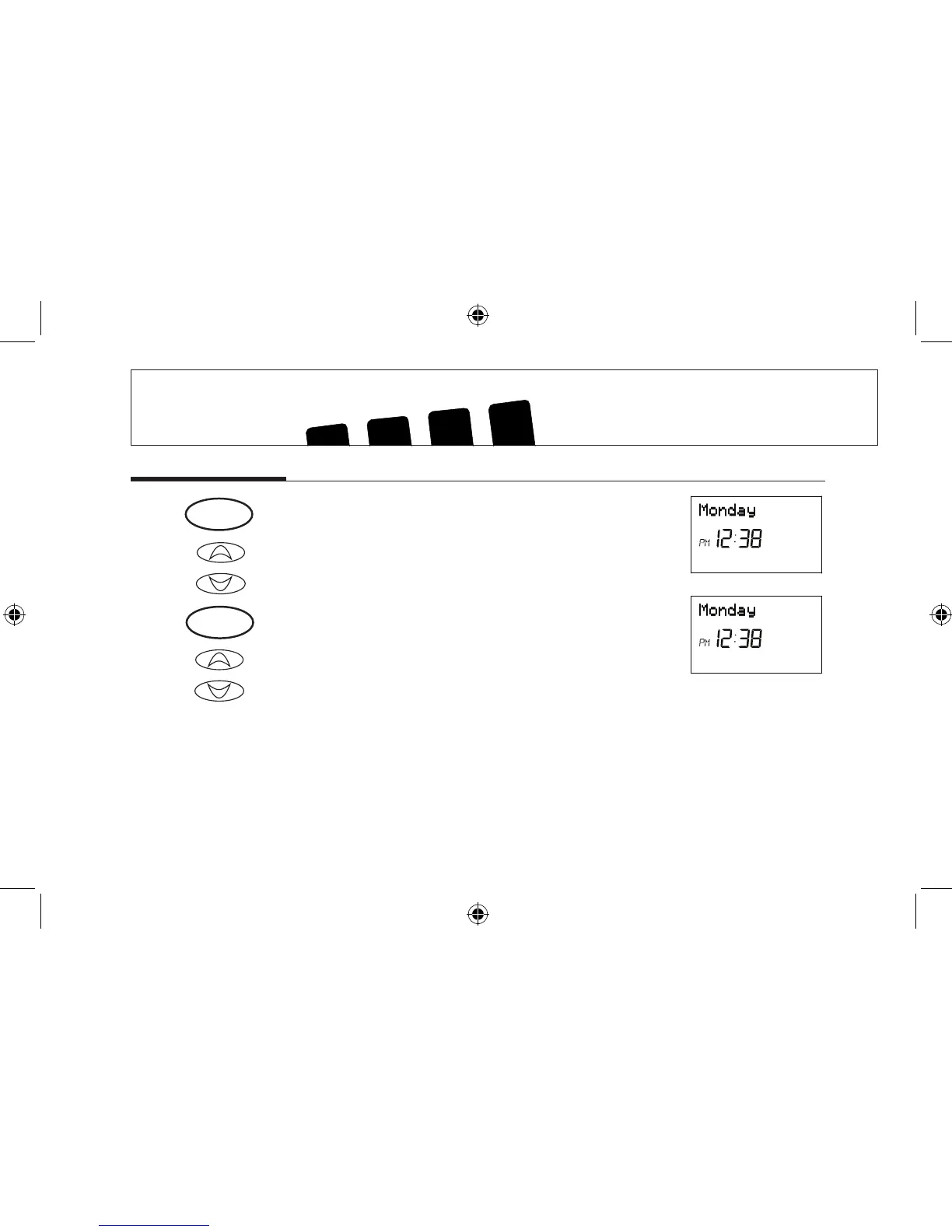 Paso 1 ■ Presione para ingresar al modo de ajuste de hora y día. Des-