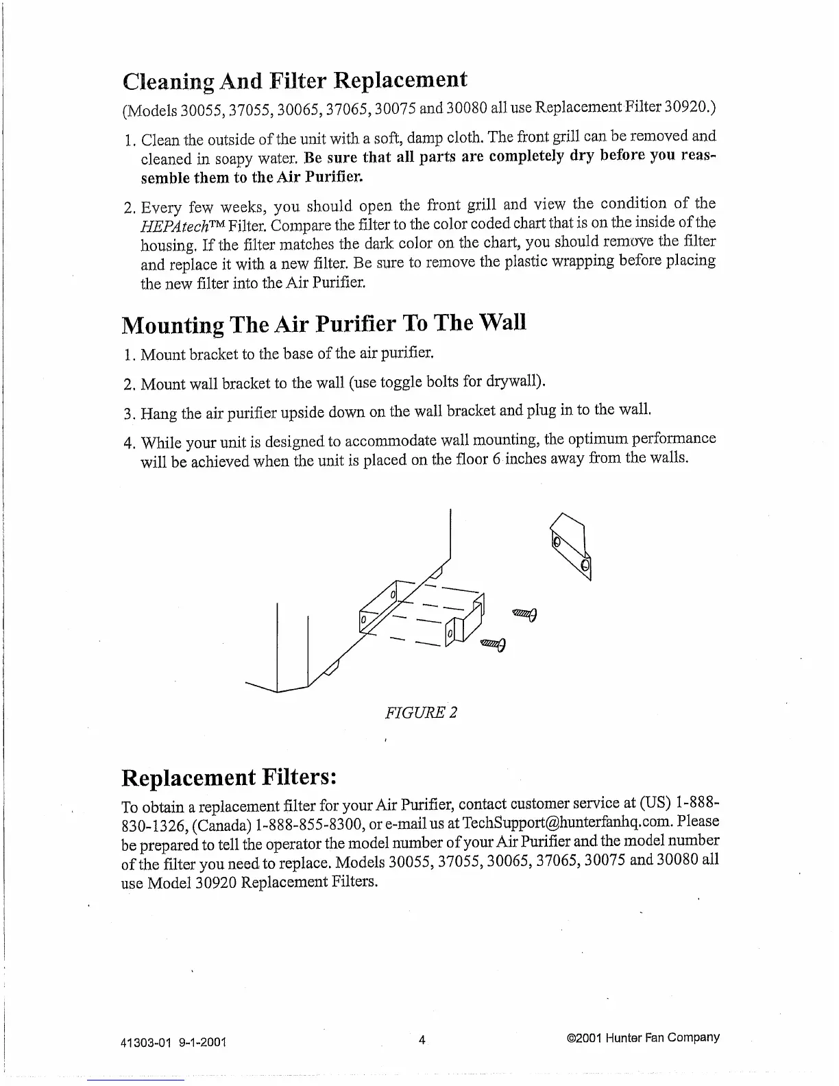 Hunter HEPAtech 30055 - Cleaning And Filter Replacement; Mounting The Air Purifier To The Wall; Replacement Filters