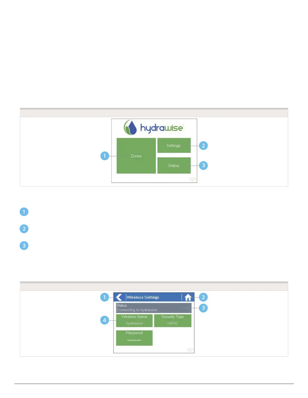 The Home screen, shown below, has 3 buttons allowing you to view and run your irrigation