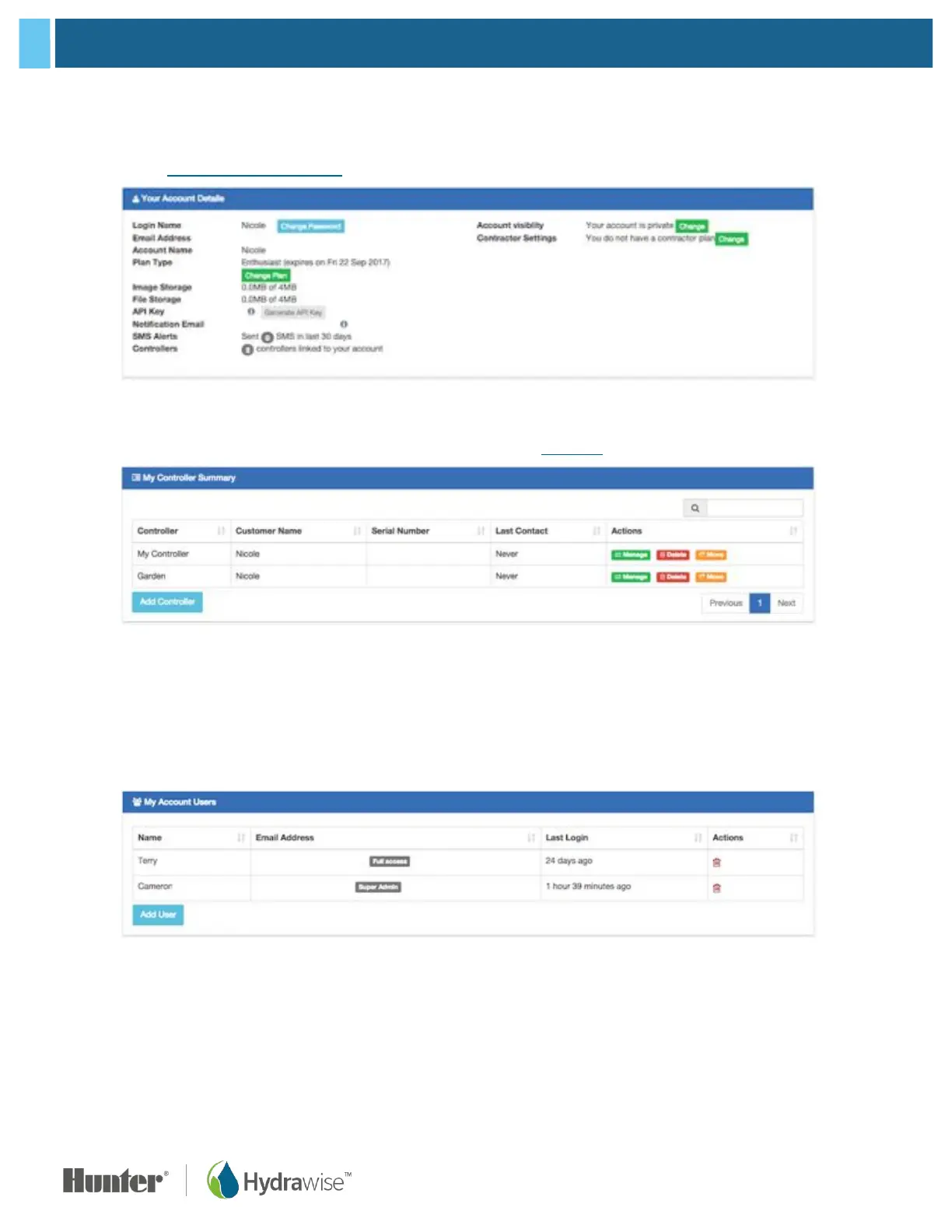 By default, nobody else can see your account. However, if you want help from a Hydrawise contractor then