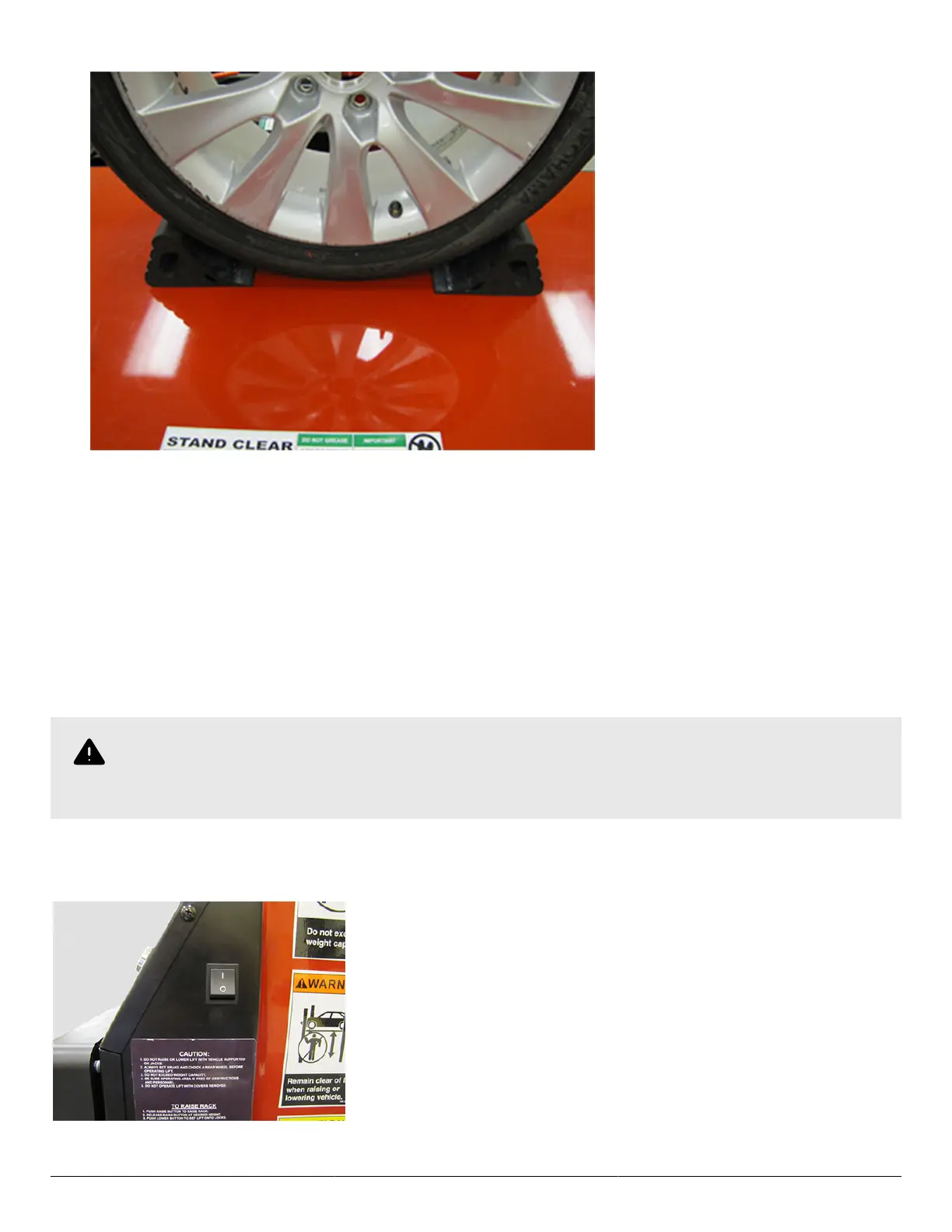 3. Leave the wheel chocks in place while elevating the lift, performing service operations on the vehicle, and while