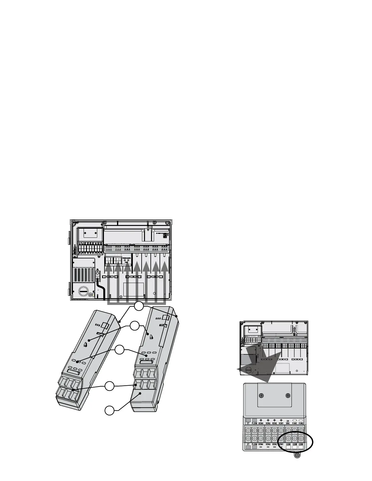 for station wiring connections. The base configuration is 12 stations (two 6-station modules installed) with a maximum
