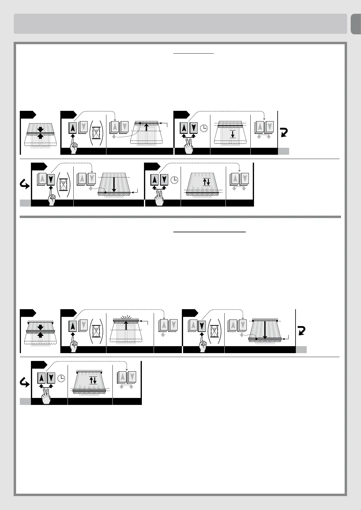 03. Fortsättatthållaupp-knappen nedtryckt. Tryck samtidigt på ned-knappen och håll den nedtryckt tills markisen har slutfört en kort rörelse nedåt. Släpp sedan upp