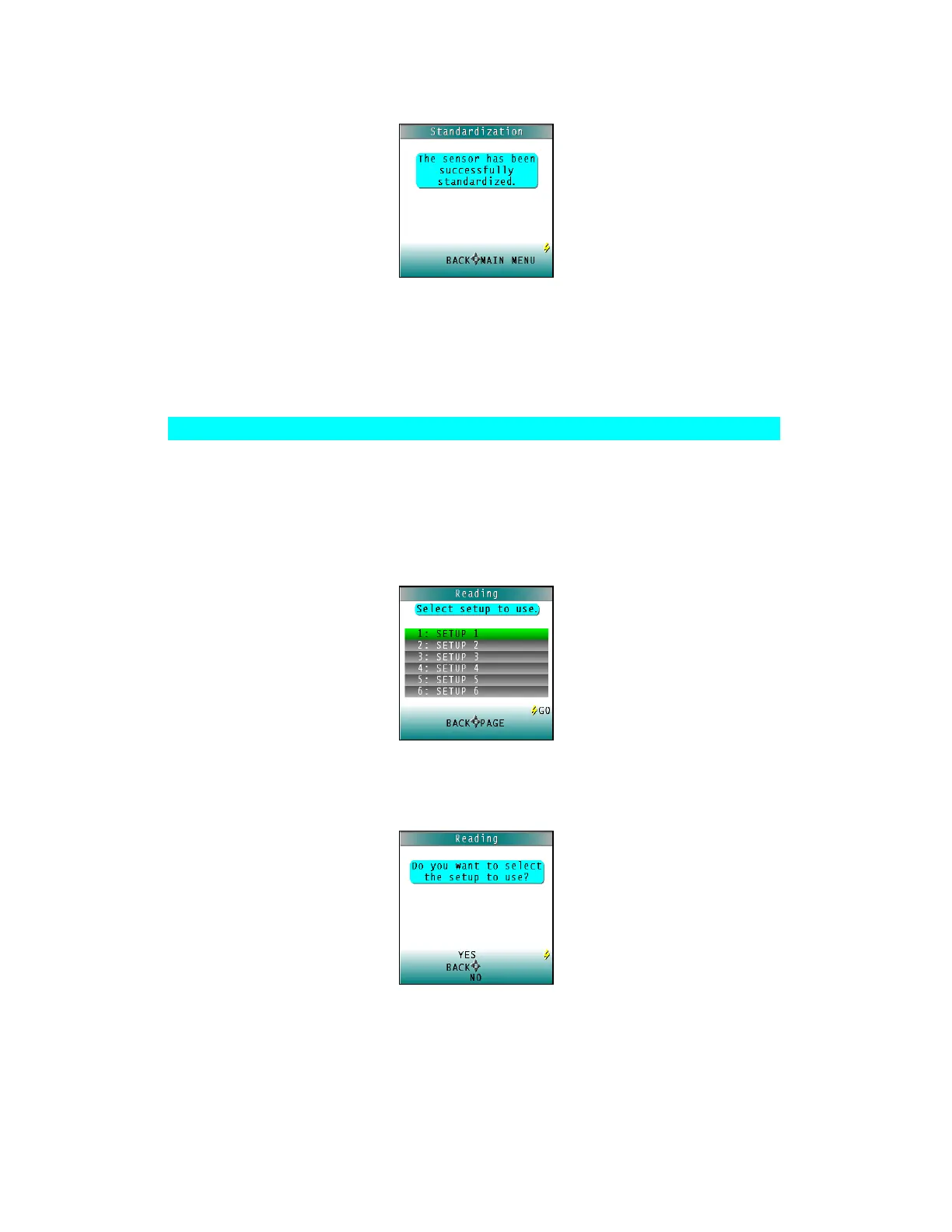 2. The first Reading screen appears, for setup selection. To read the last product setup