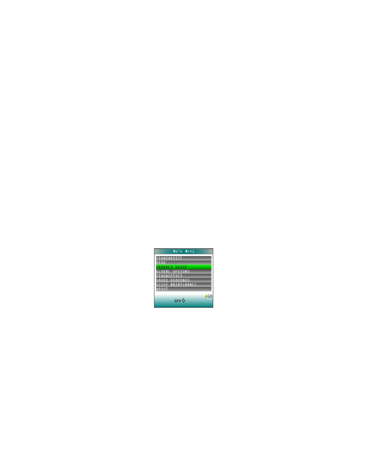 Product Setup is selected from the main menu by moving the cursor highlight to the Product