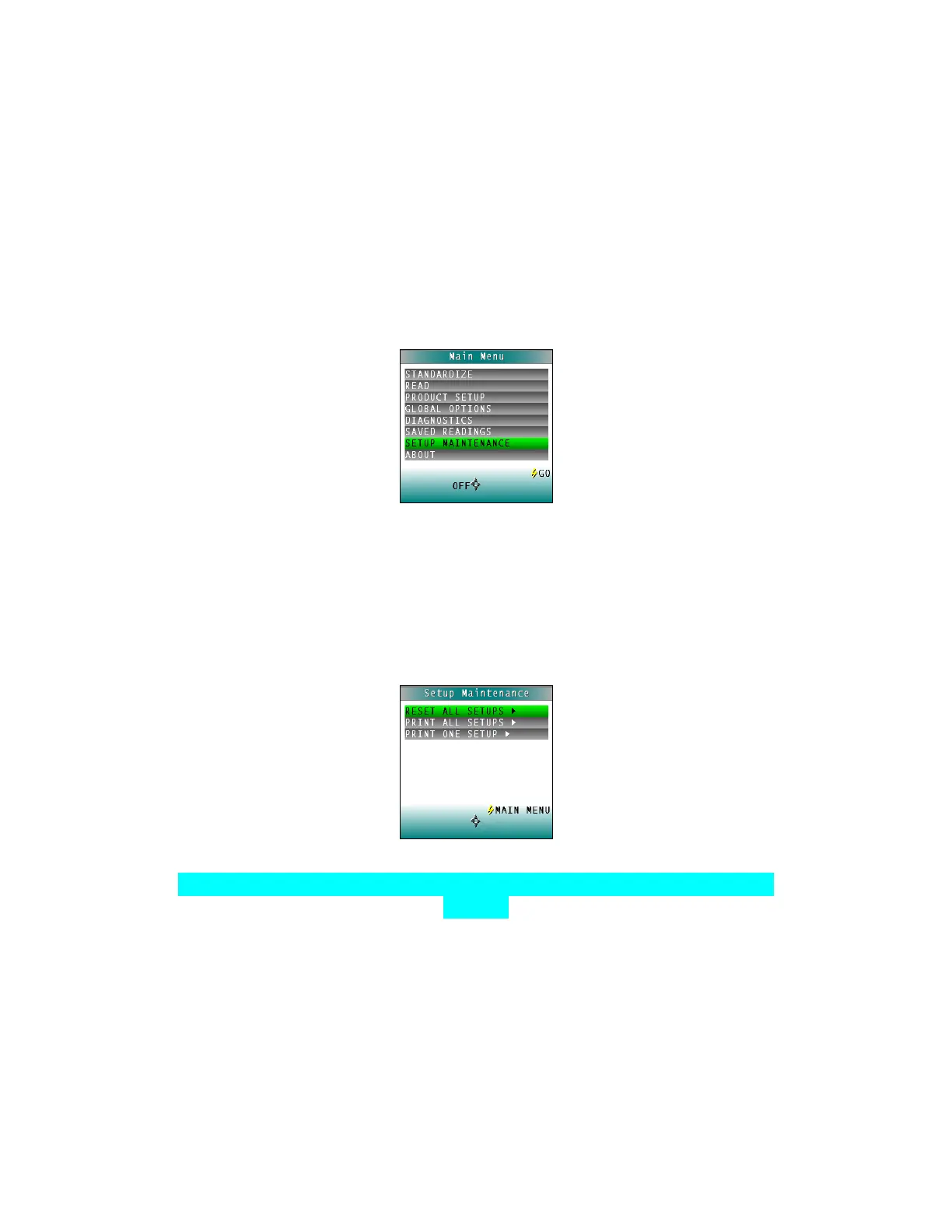 SETUP MAINTENANCE is selected from the main menu by moving the cursor highlight to its