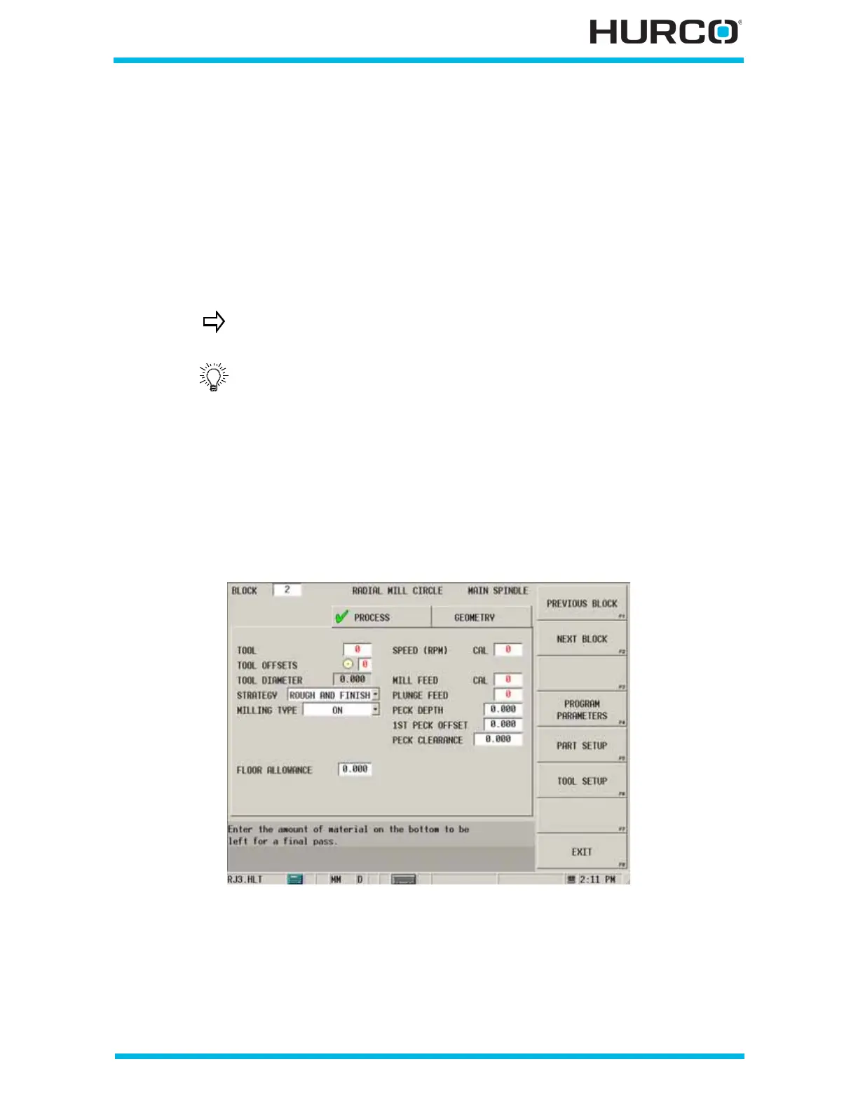 From the New Block (Radial Milling) softkey menu, select RADIAL CIRCLE F2, and the