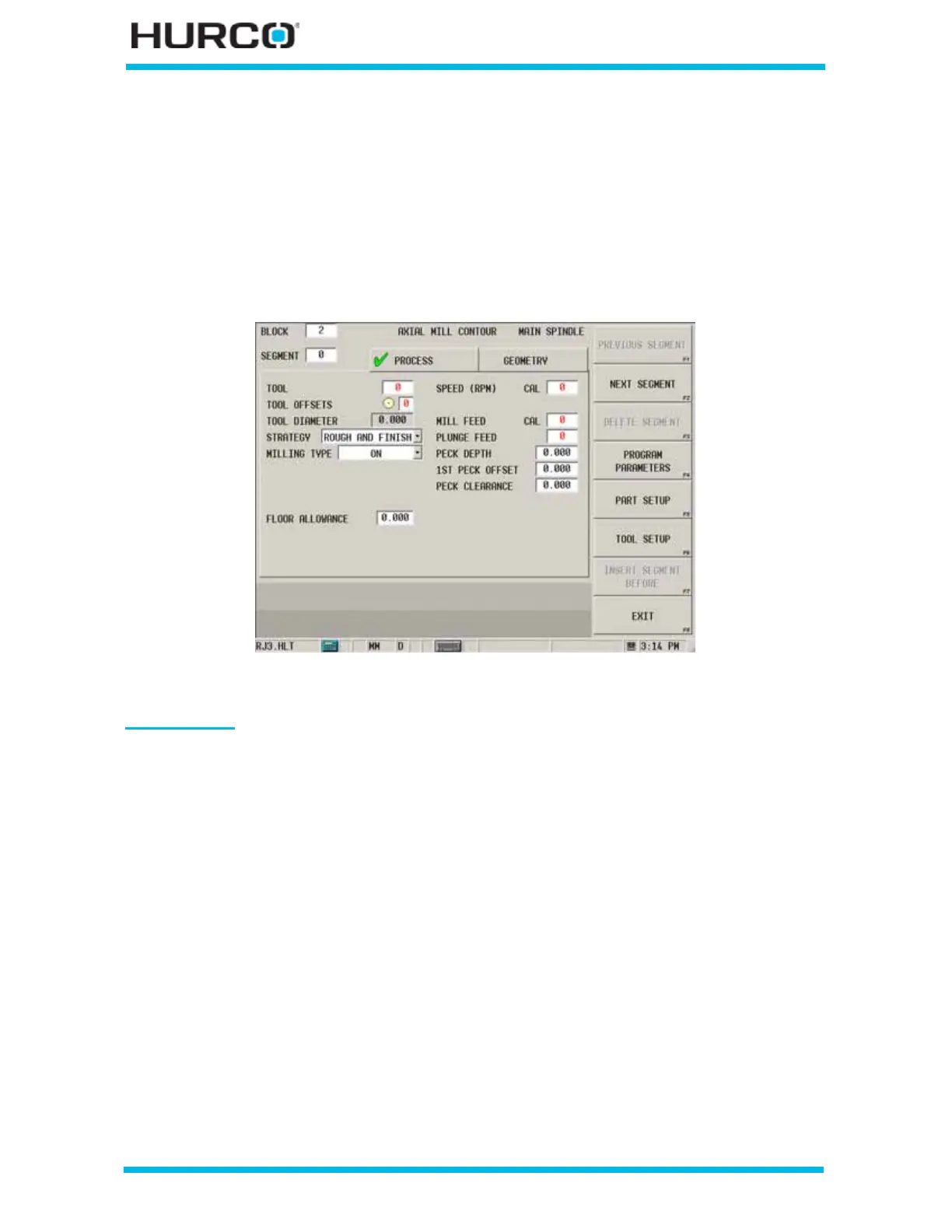 Axial Mill Contour screen appears with Process and Geometry tabs. Program the tool and