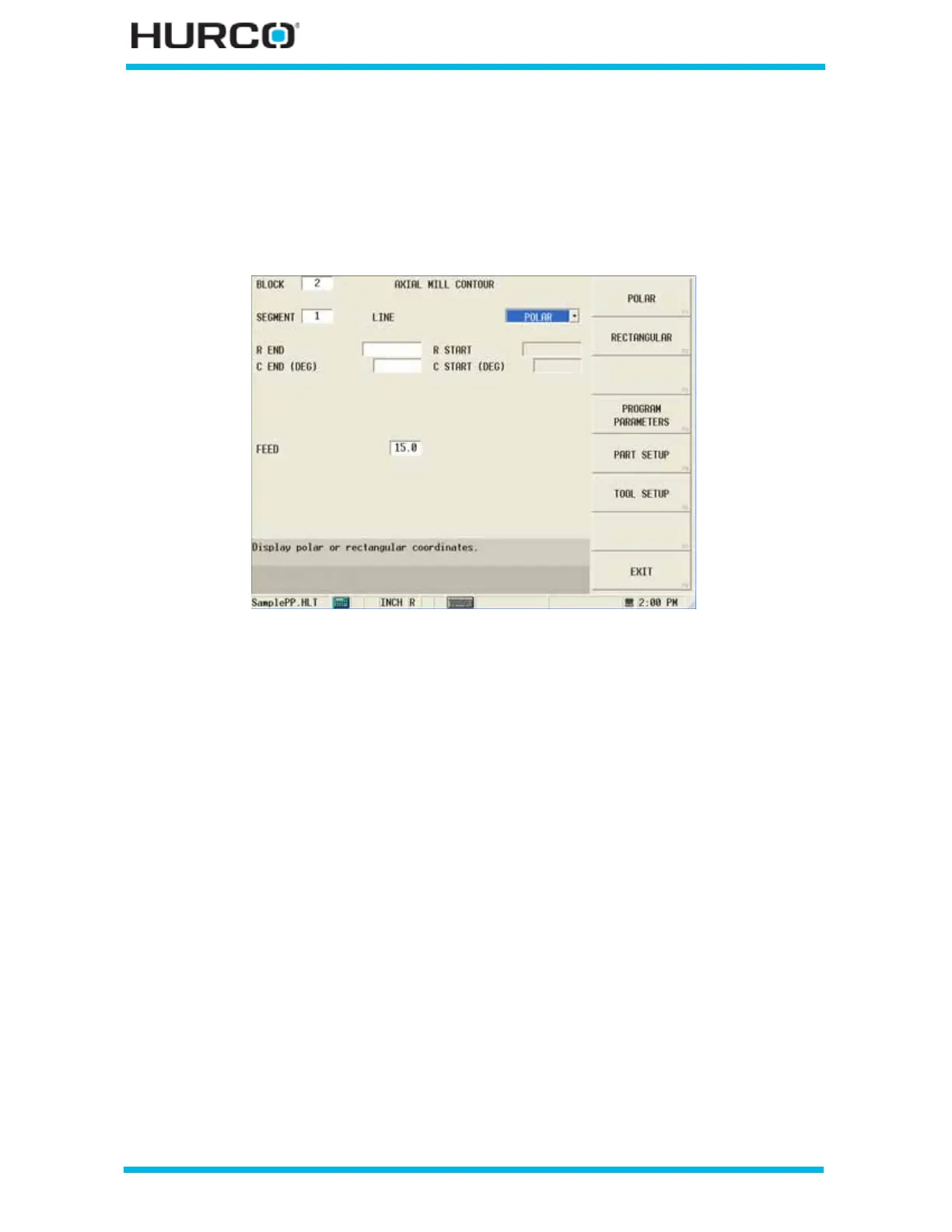 Figure 2–113. Live-Tooling Axial Mill Contour Line Segment screen: Polar Coordinates