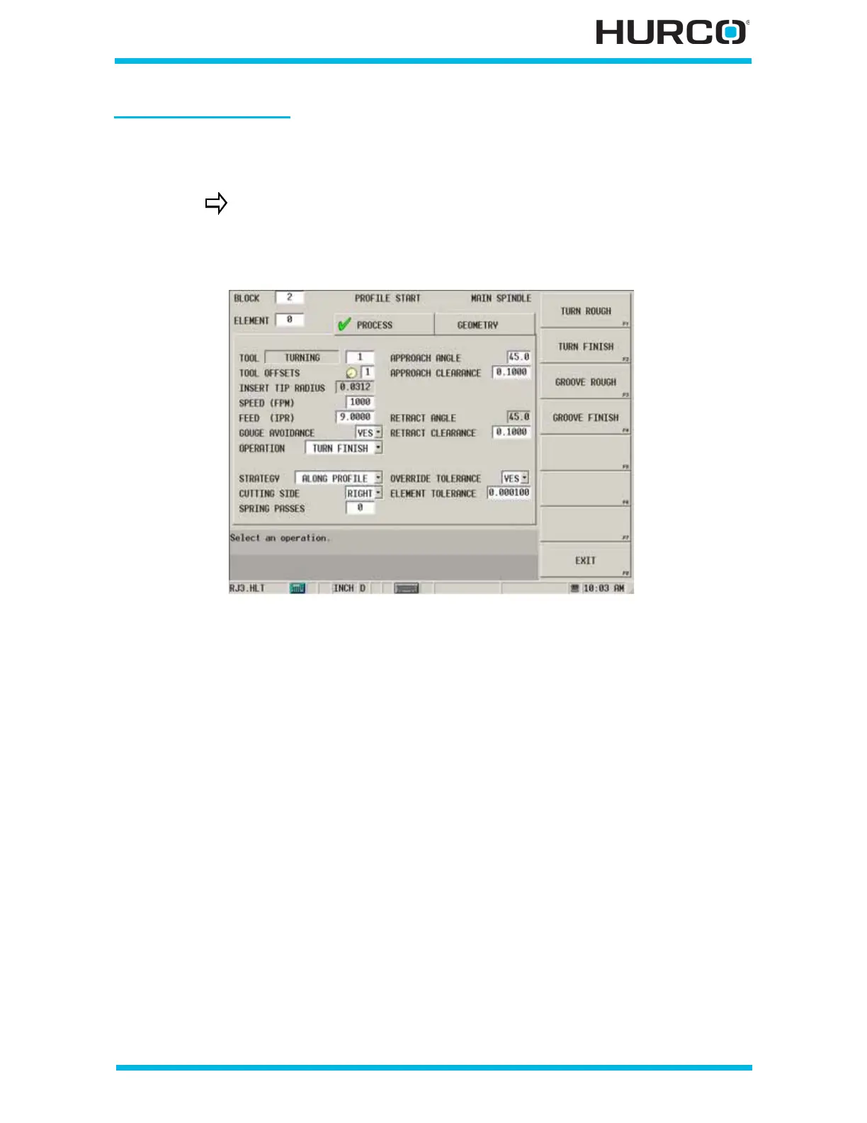 Figure 2–8. Profile Start Process Tab Turn Finish Operation screen