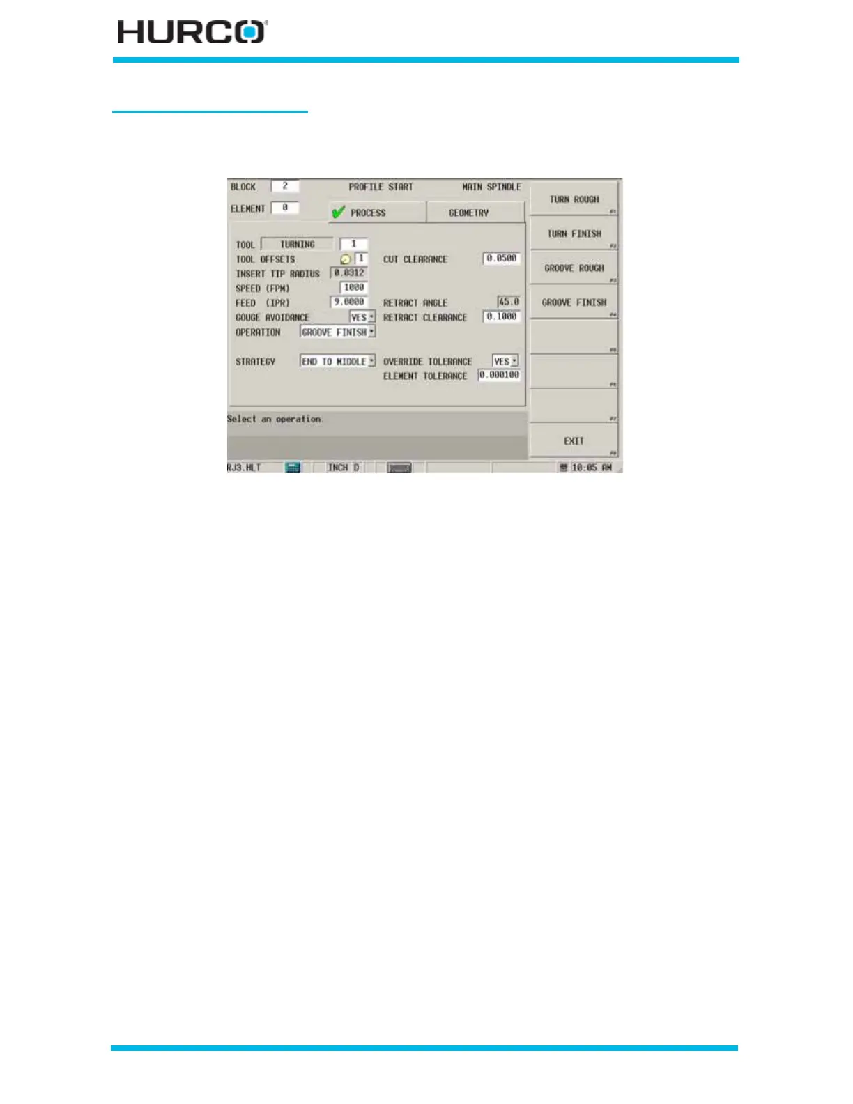 Figure 2–13. Profile Start Process Tab Groove Finish Operation screen