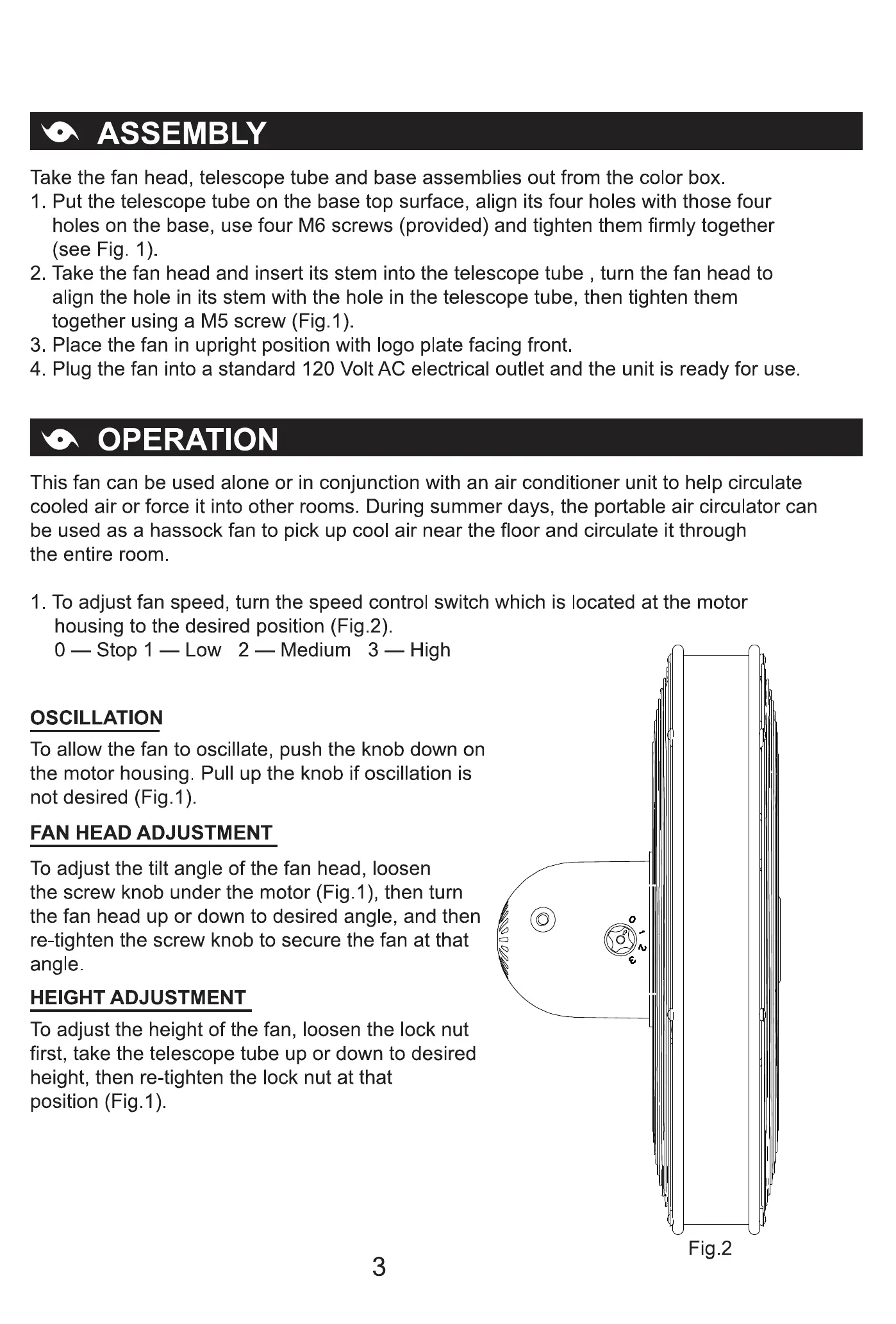 4. Plug the fan into a standard 120 Volt AC electrical outlet and the unit is ready for use.