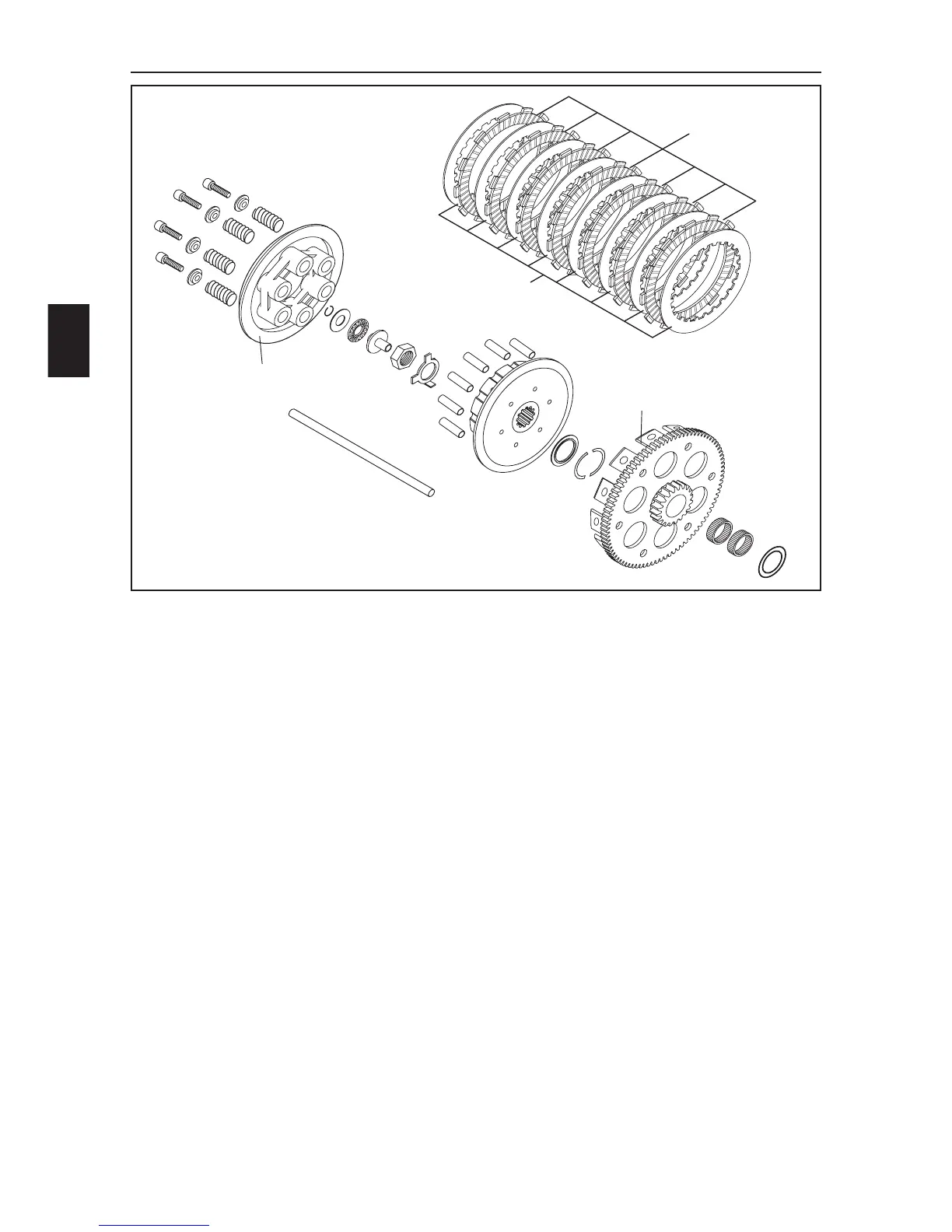 Check the thrust faces (B) of the lining disks and the outer clutch hub for wear. Replace the lining disks and the