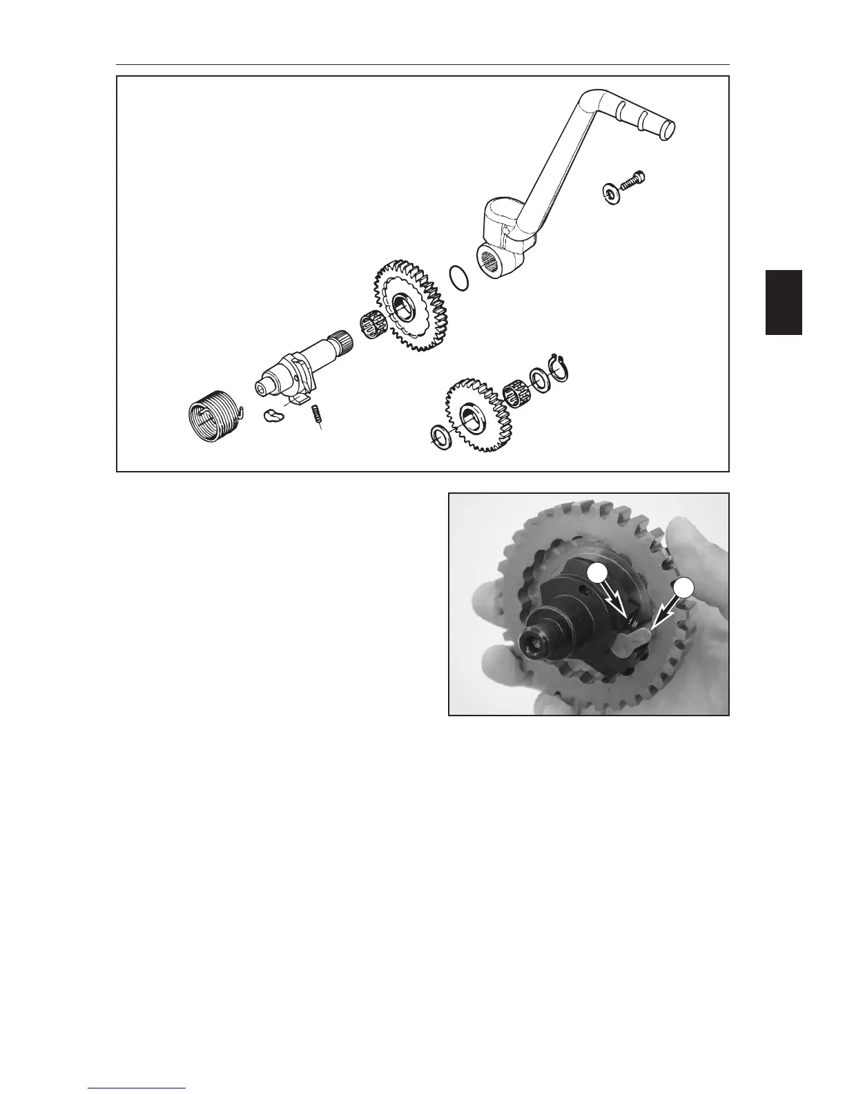 – Check the kickstarter shaft (2) for wear or damage.