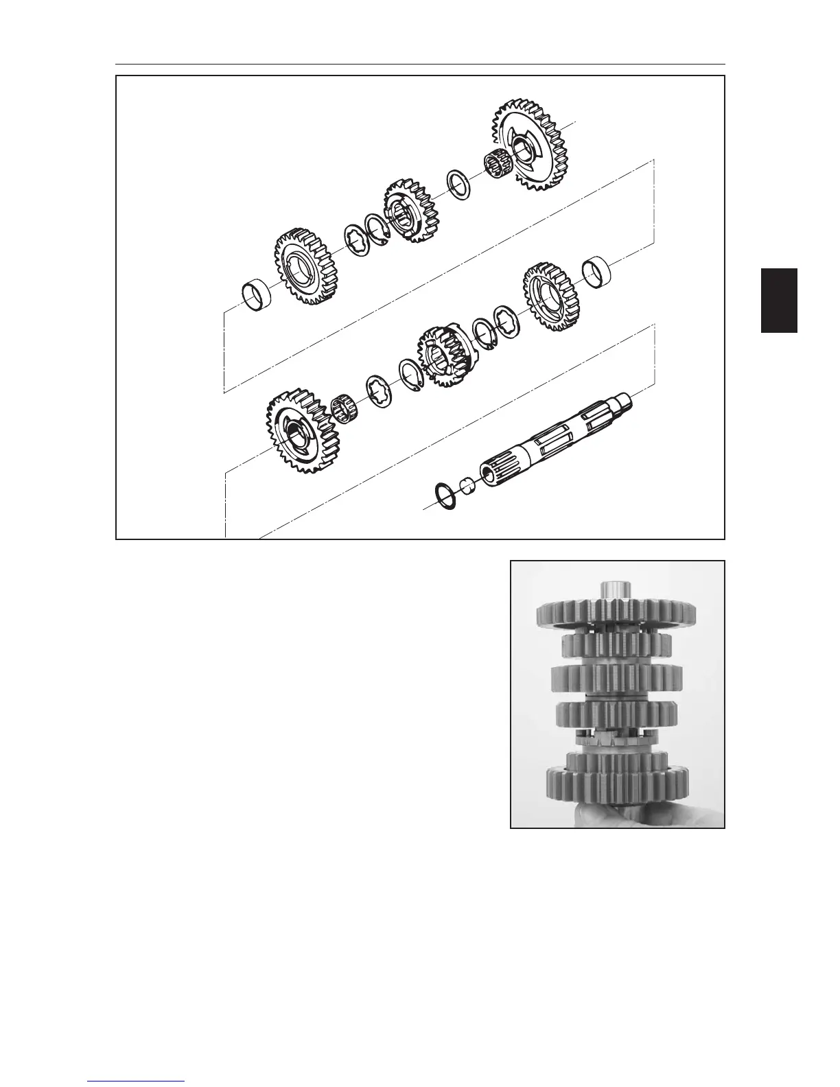 – Mount the needle bearing (1) and the 2nd gear idler (2) on the