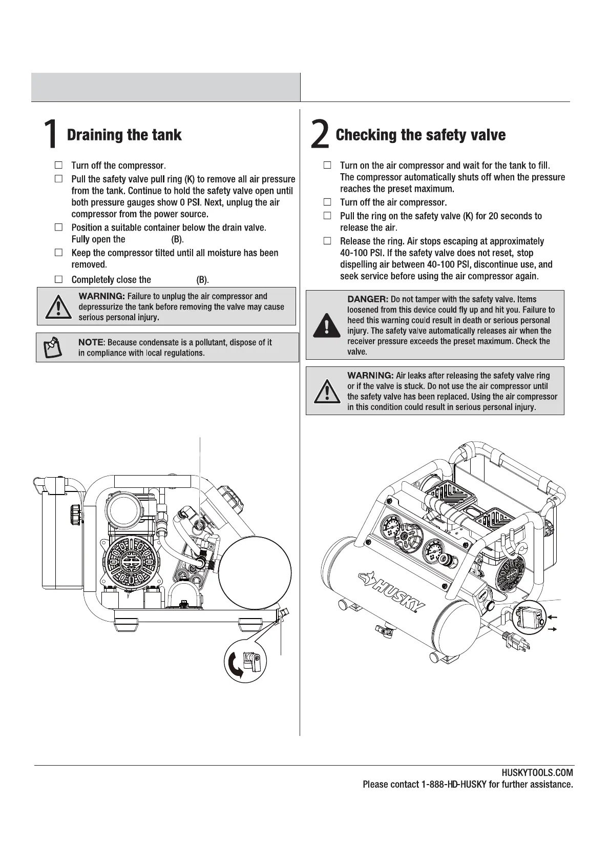 Husky 3300113 - Maintenance Procedures; Draining the Air Compressor Tank; Checking the Safety Valve