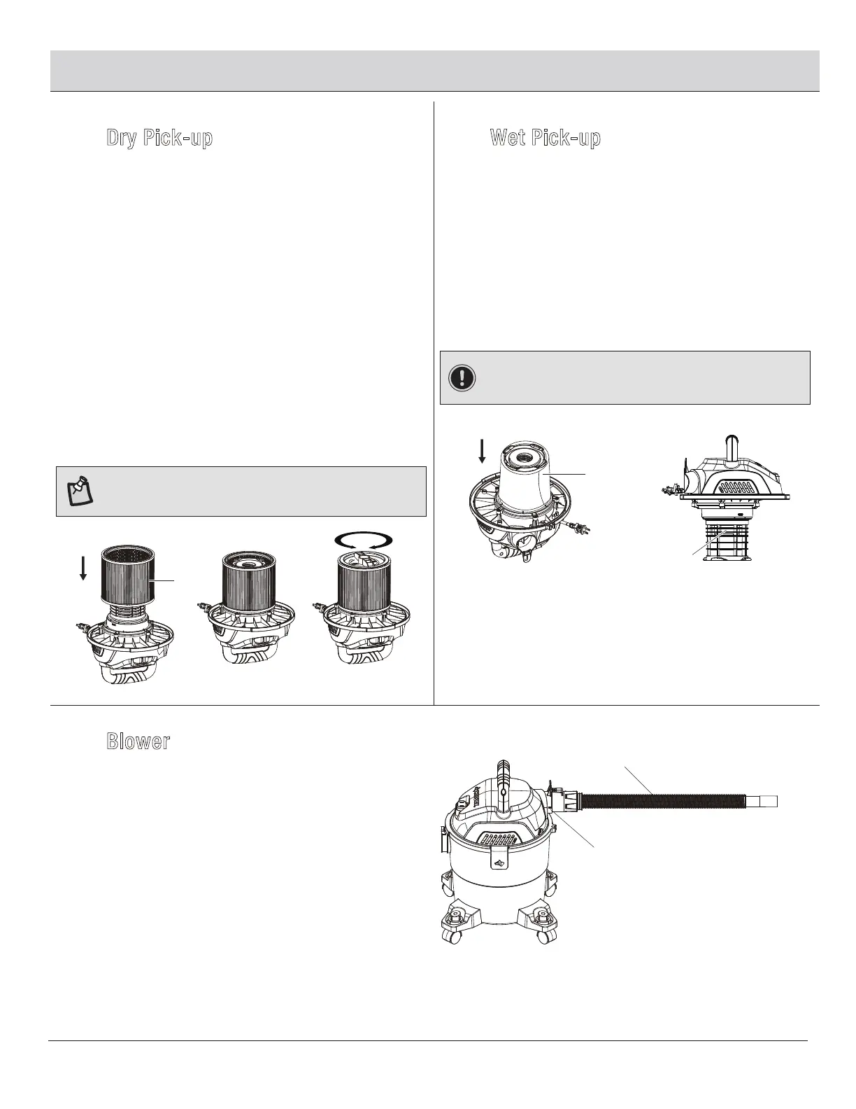 The cartridge filter (M) can be used for wet or dry pick-up.