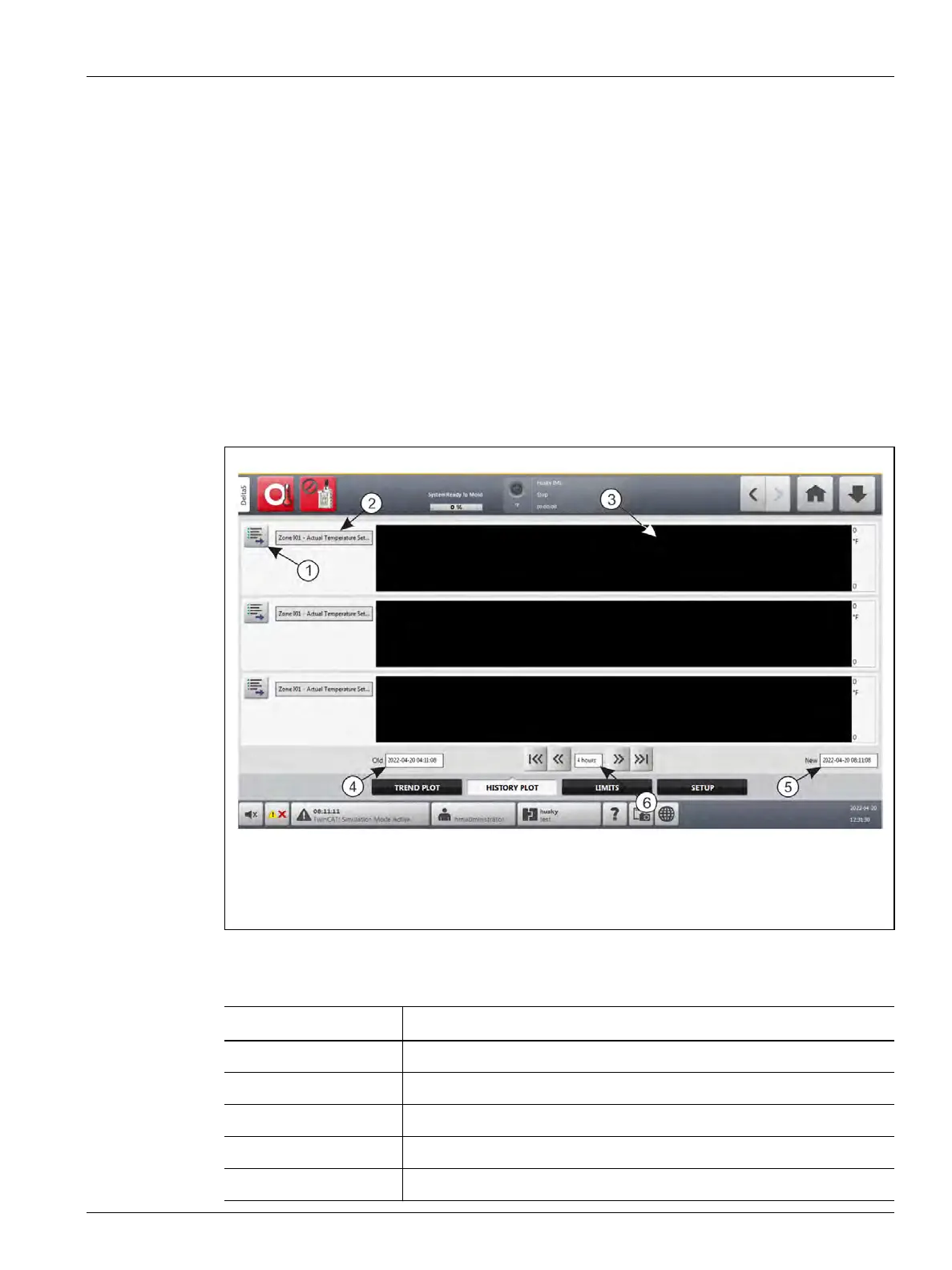 Items on the History Plot screen are described in Table 12-1.