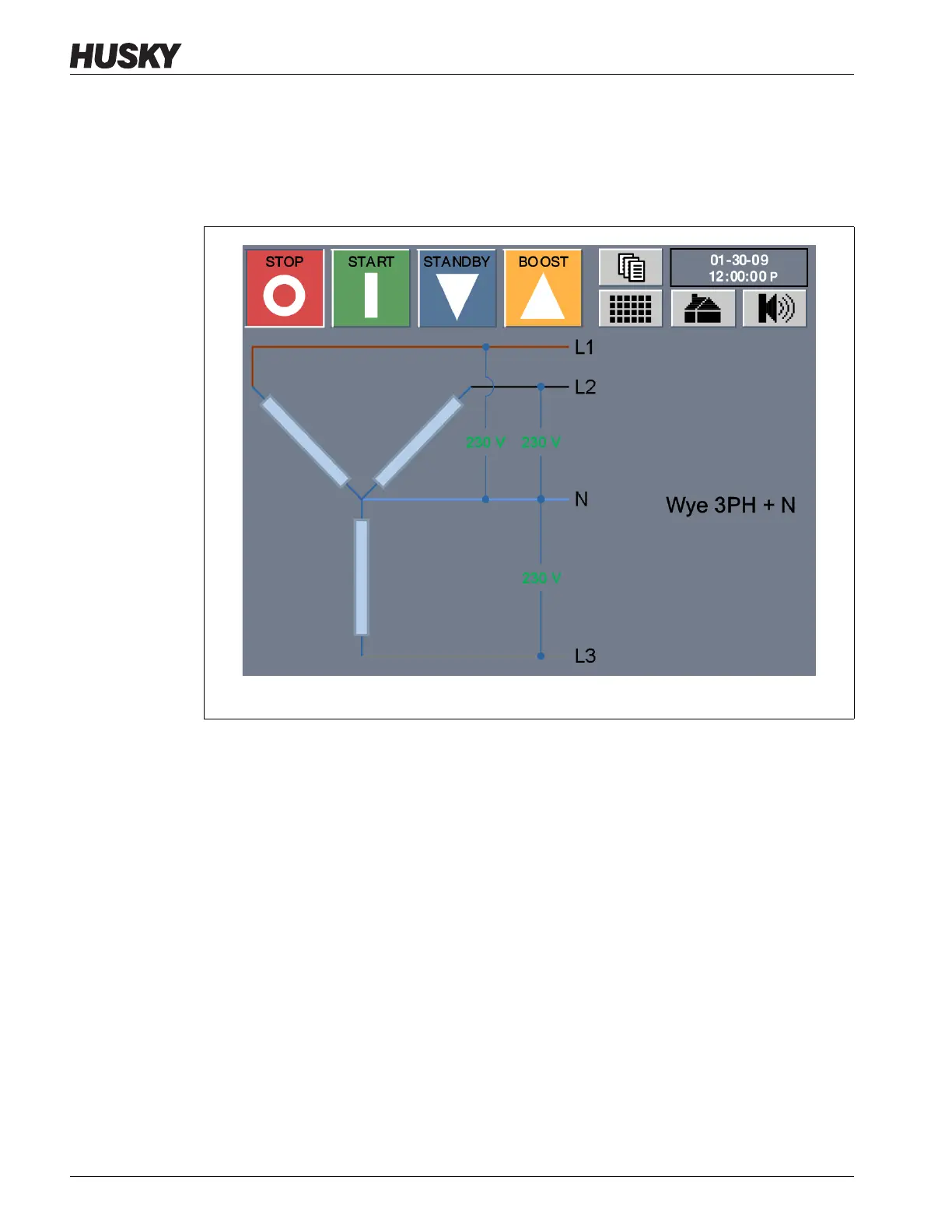 The image on the left of the Wye 3 PH+N Supply Voltage screen is a visual representation of