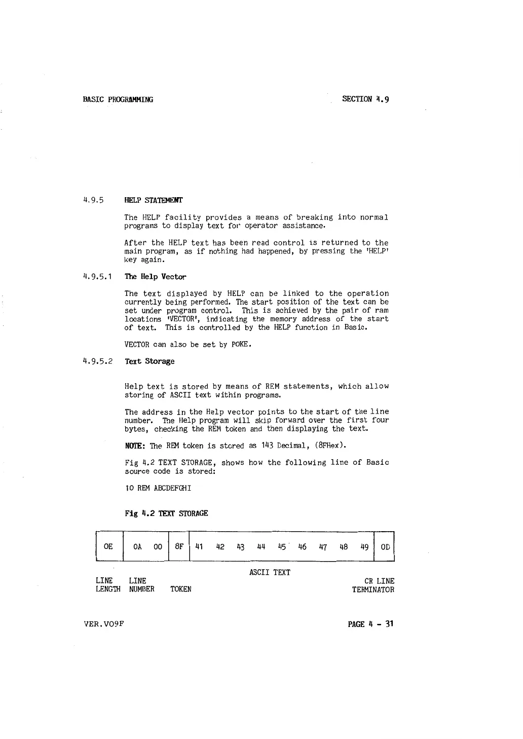 4.2 TEXT STORAGE, shows how the following line of Basic