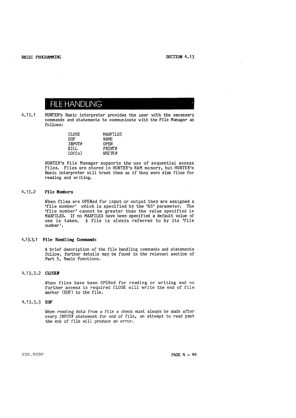 files. Files are stored in HUNTER's RAM memory, but HUNTER's