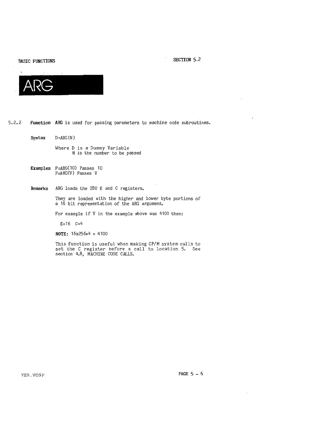Remarks ARG loads the Z80 E and C registers.