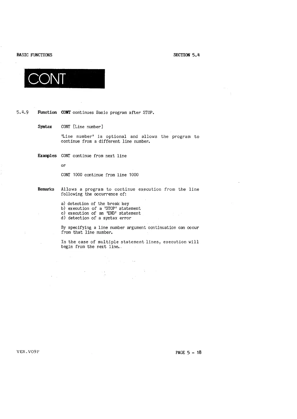 Function CONT continues Basic program after STOP,