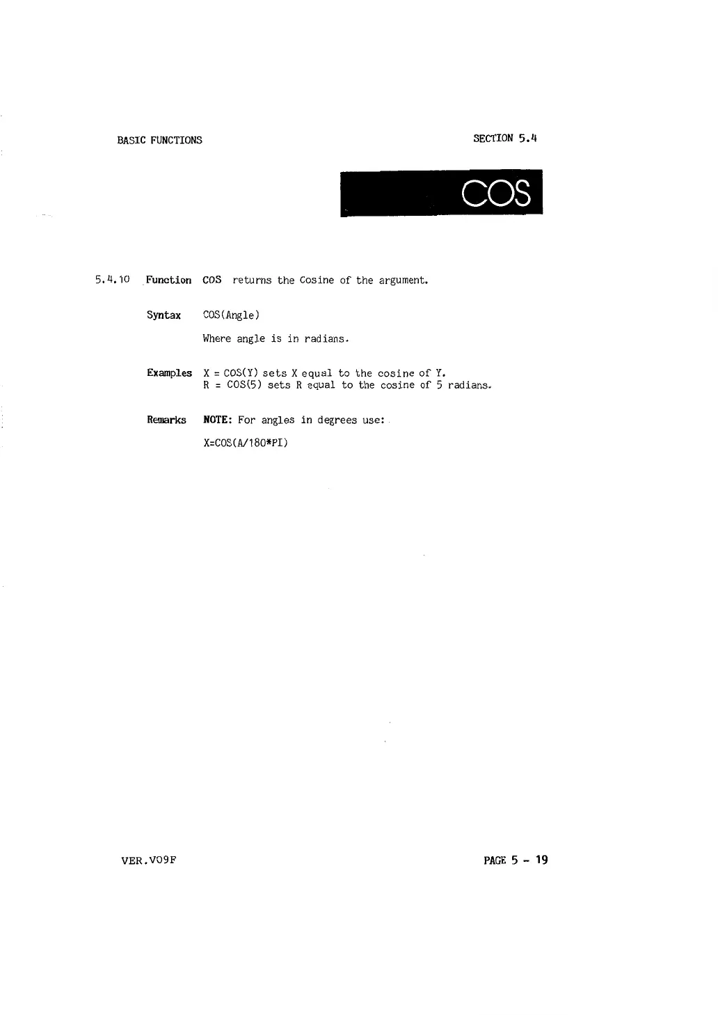 5,4, 10 .Function COS returns the Cosine of the argument.
