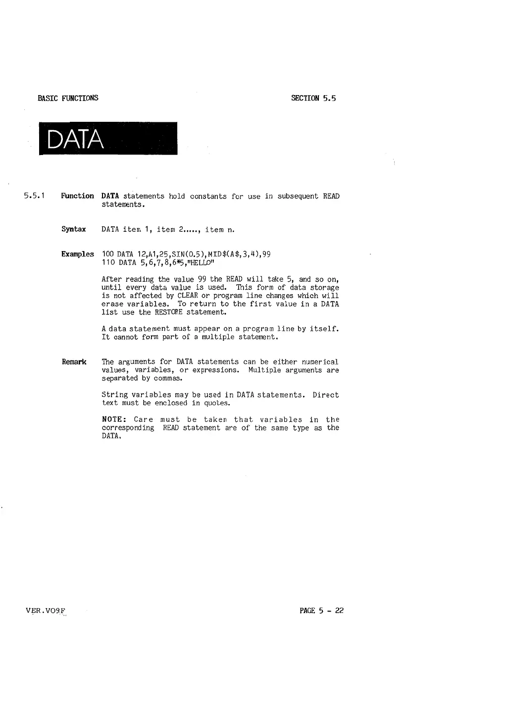 Examples 100 DATA 12,A1,25,SIN(0,5),MID$(A$,3,4),99