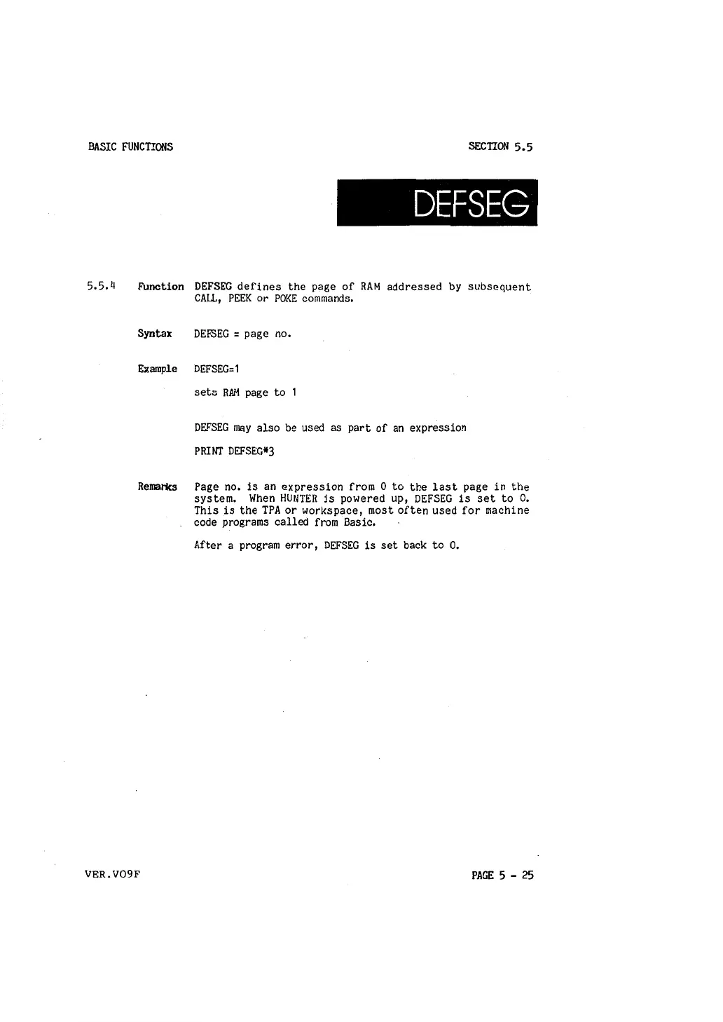 Function DEFSEG defines the page of RAM addressed by subsequent