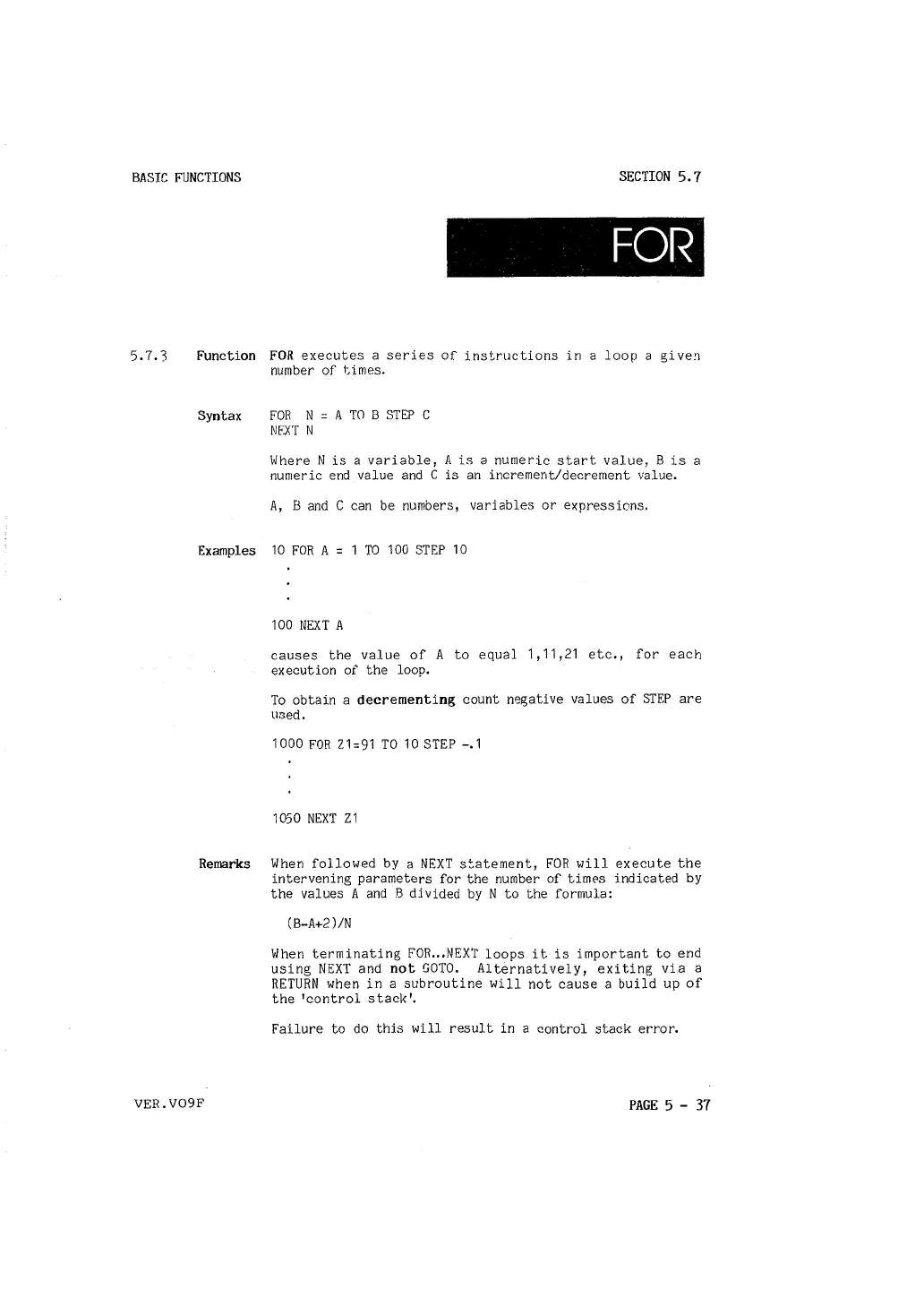 Remarlcs When followed by a NEXT statement, FOR will execute the