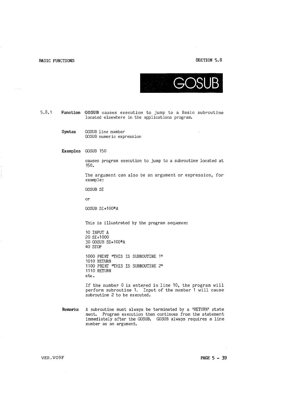 Function GOSUB causes execution to jump to a Basic subroutine