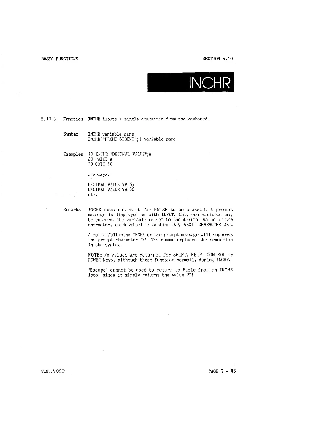 5. 10.3 Function INCHR inputs a single character from the keyboard.